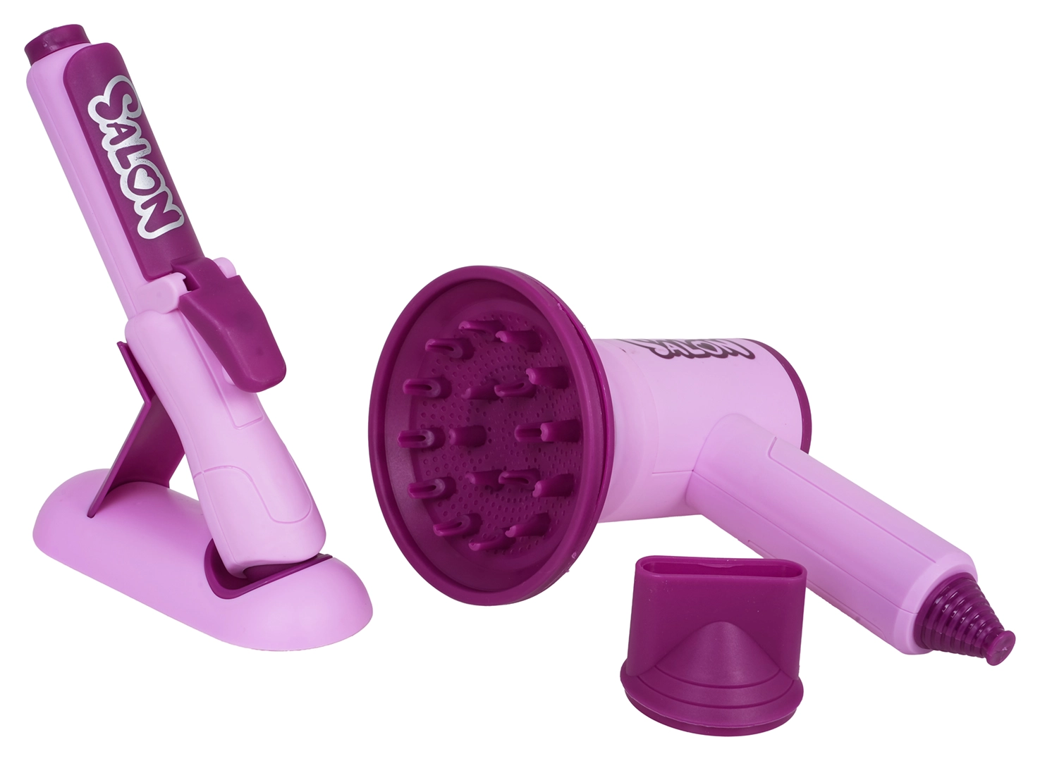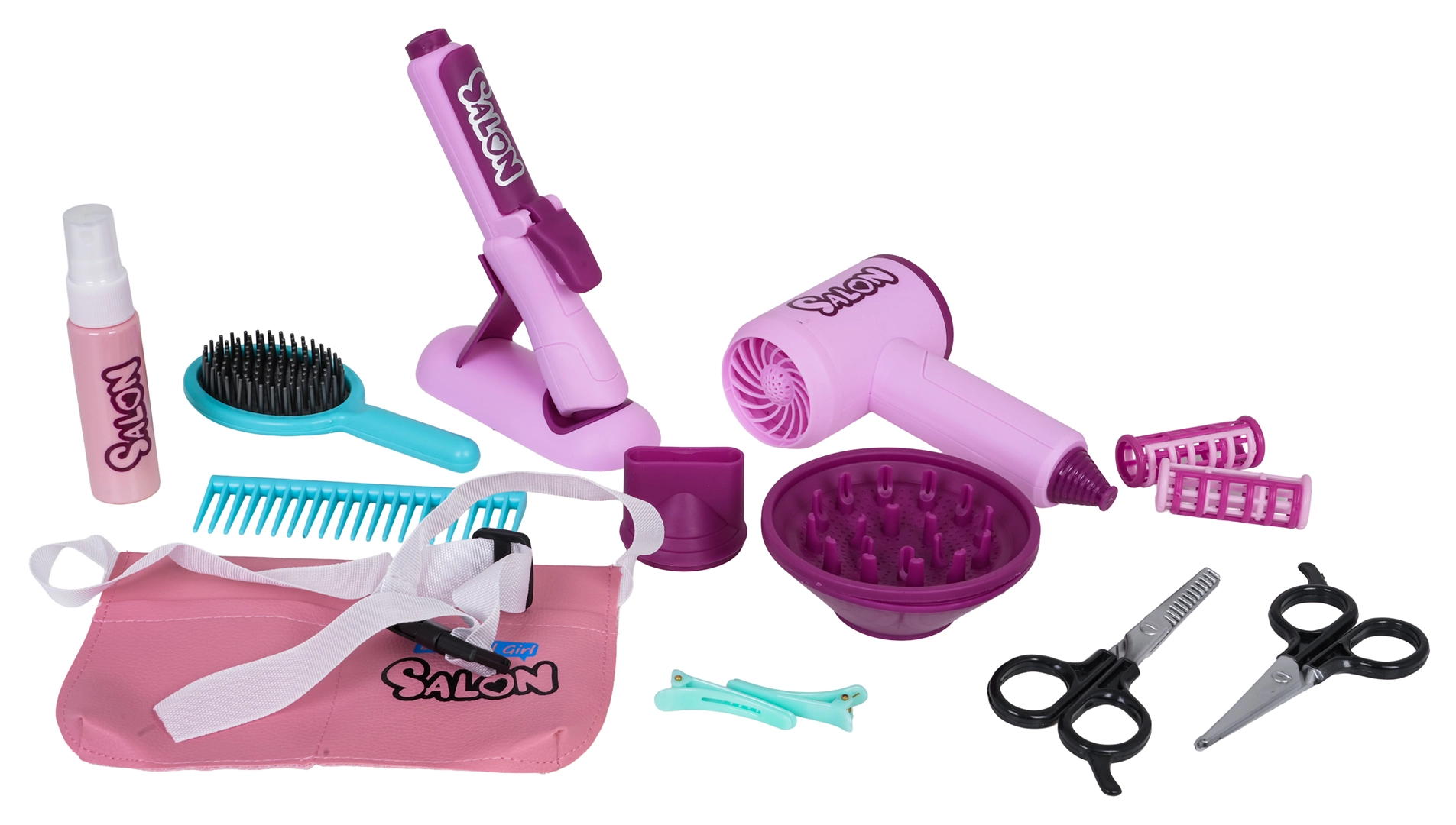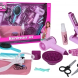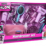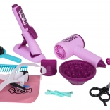 Del kompleta je otroški sušilnik z dvema nastavkoma (difuzor in koncentrator), ki oddaja zvok sušenja in zagotavlja nežen zračni tok za avtentično izkušnjo. Otroški likalnik je napajan z gumbnimi baterijami in ima svetlobni učinek. Komplet dopolnjujejo glavnik, krtača, škarje, redčilne škarje, sponke, navijalke in steklenička za »kozmetiko« – popolno za kreativno igro in razvoj fine motorike.