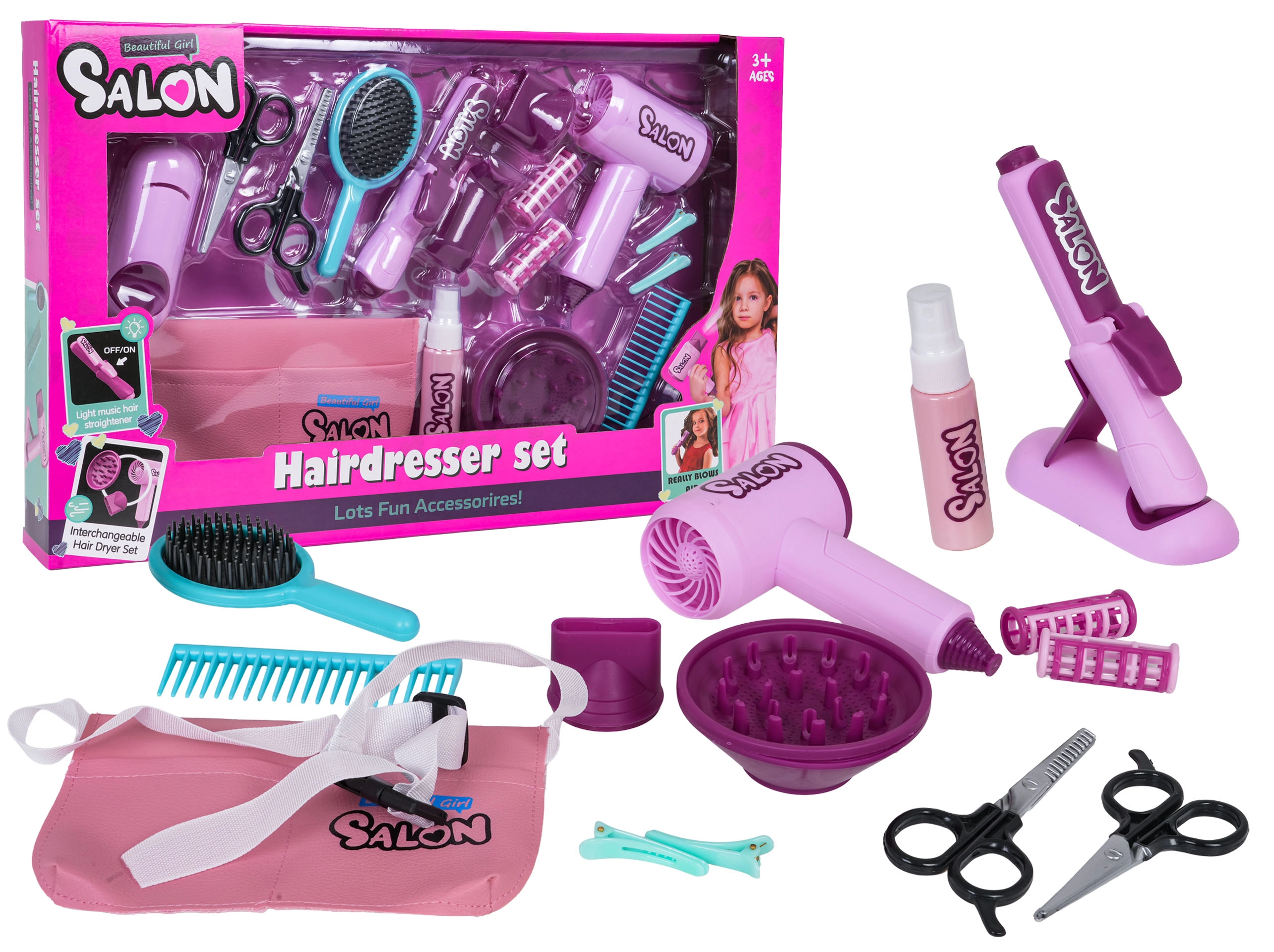 Odkrijte čar lastnega salona s tem bogato opremljenim kompletom za male frizerke od 3. leta dalje. V njem najdete funkcionalni otroški sušilnik za lase z zamenljivimi nastavki, osvetljeno likalnik za lase, kodralnik, glavnik, krtačo, sponke, navijalke, škarje in praktično rožnato torbico za na pas. Sušilnik oddaja zvok in ima lahek »pih«, likalnik sveti – idealno za realistično igro frizerskega salona.