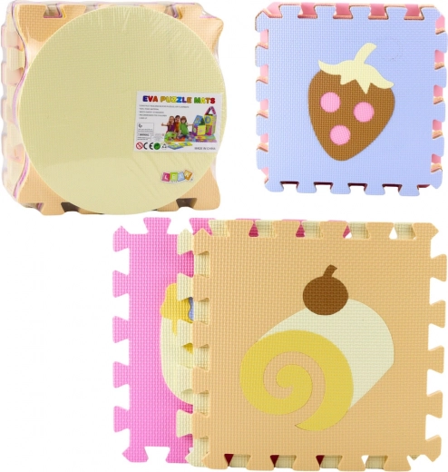 Ta učna penasta podloga je idealna za prve korake, plazenje in vsakodnevno igro. Deli iz mehke in prožne EVA pene se preprosto povezujejo in omogočajo sestavo udobne igralne površine ali osnovnih prostorskih oblik, kot je nizka ograjica. Pastelna paleta in motivi, kot so jagoda, ananas, bonbon in češnje, vabijo k odkrivanju barv in oblik.