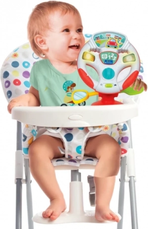Izobraževalni gumb otroke vodi pri odkrivanju števil v igrivih izštevankah. Ključ prižiga in ugaša “motor” ter ponuja 2 igralna načina. Premično zrcalce in menjalna ročica krepita fino motoriko in koordinacijo. Zahvaljujoč priseski igračo zlahka pritrdite na ravno površino – idealno za pladenj otroškega stolčka ali mizo.