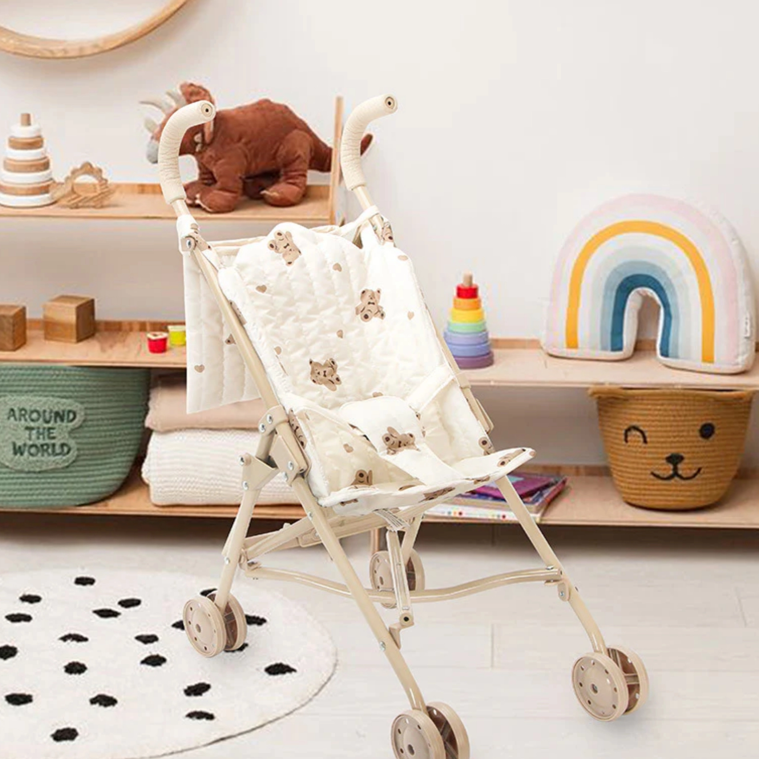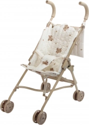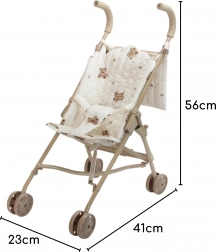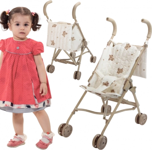 Ta stilski voziček za punčke združuje udobje, varnost in praktično zložljivost. Dvojna kolesa omogočajo tekoče premikanje, medtem ko se čvrsta, a lahka konstrukcija v trenutku zloži na kompaktno velikost. Krem sedež z ljubkim vzorcem medvedkov doda igri čar in vabi k novim dogodivščinam doma in na prostem.