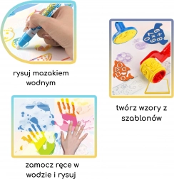 Del kompleta je bogat nabor dodatkov, ki razširi možnosti igre – od vodnih flomastrov in žigov do valjčka z vzorci ter šablon črk in oblik. Vse je lahko, kompaktno in primerno za dom in potovanja.
