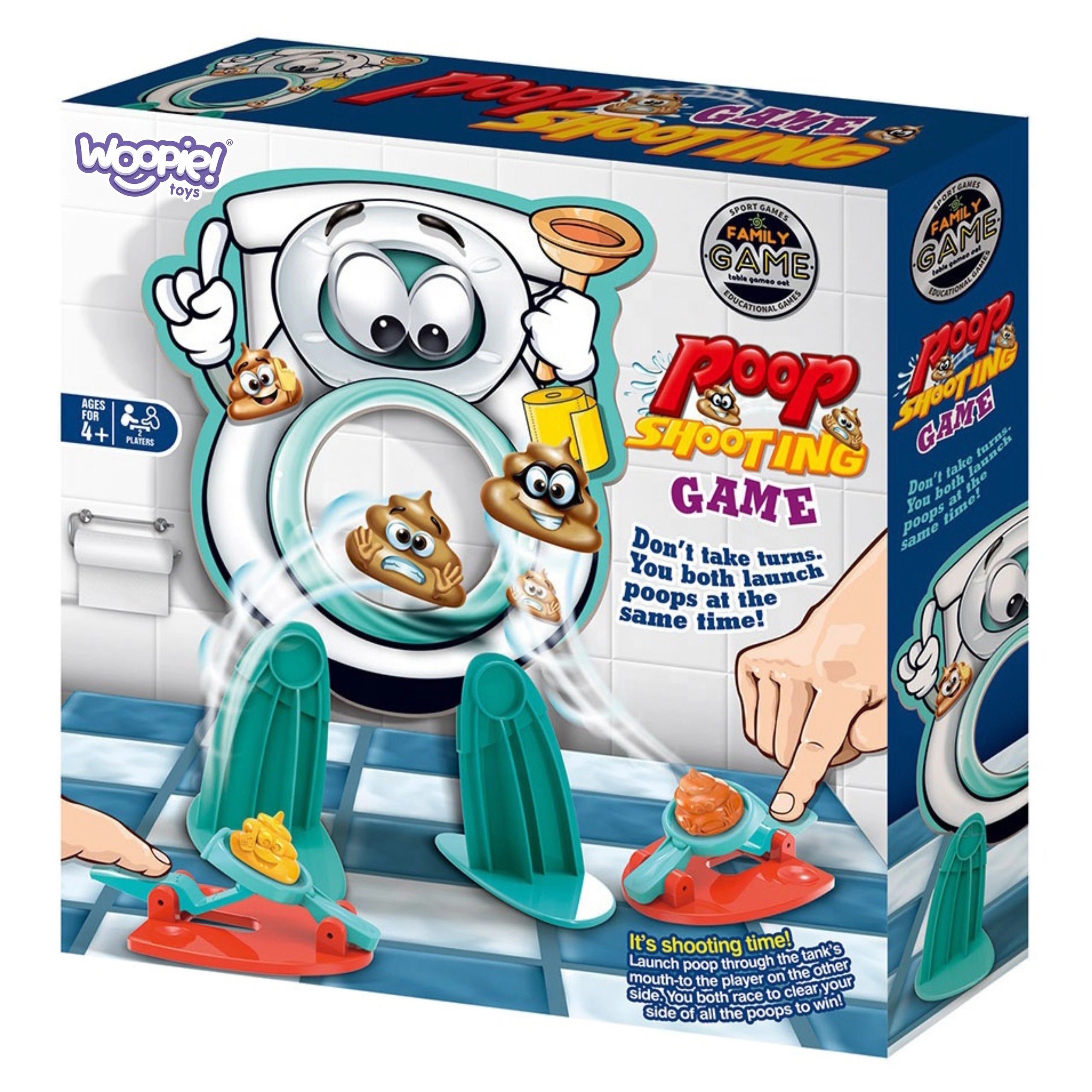 Zabavna družinska igra Woopie Streljanje kakcev v stranišče prinaša hitro in veselo tekmovanje za dva igralca. Vsak igralec izstreljuje plastične kakce iz svoje izstreljevalke v nasmejano stranišče – kdor prvi počisti svojo stran, zmaga! Zaradi lahke konstrukcije, gladkih robov in preprostega upravljanja je idealna za družinske večere, otroške zabave in kot zabavno darilo za otroke od 4. leta dalje.