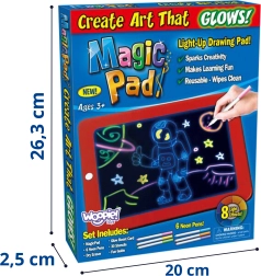 Čarobna risalna tablica WOOPIE spremeni otroške risbe v svetleče neonske umetnine. Zahvaljujoč LED osvetlitvi z 8 učinki, brisalni površini in neonskim flomastrom je risanje, učenje črk in računanje čisto, zabavno in maksimalno kreativno.