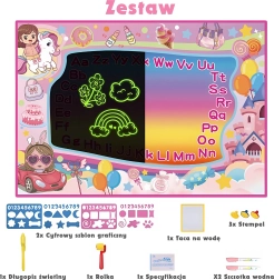 Paket vsebuje: podlogo 2v1 (pribl. 100 × 70 cm), UV pero, 2× vodni flomaster, 2× šablono, valjček, 3× žig in vpojno krpico.