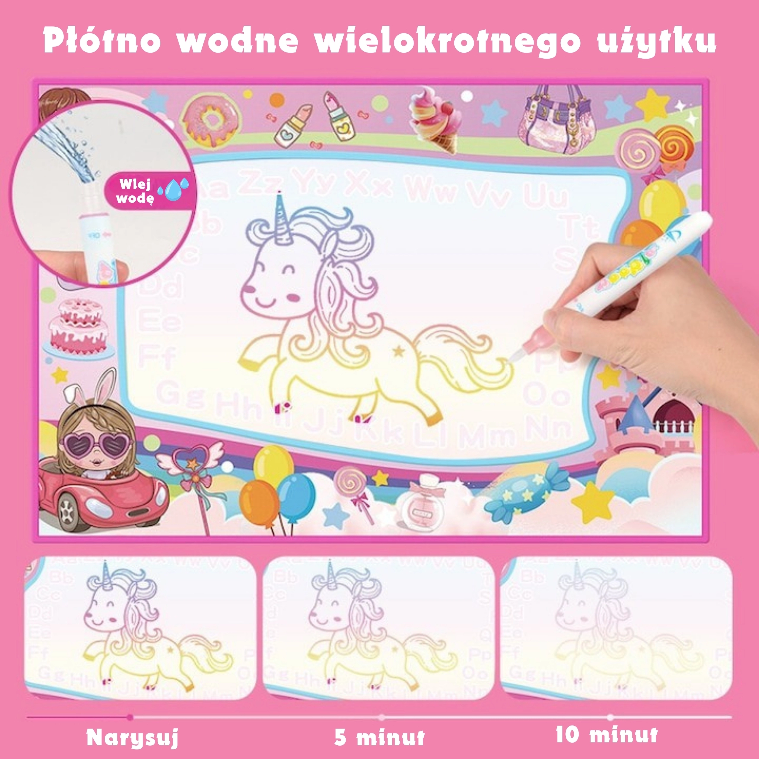 Odkrijte čar ustvarjanja brez nereda z vodno risalno podlogo 2v1 blagovne znamke WOOPIE. Otroci lahko rišejo bodisi z vodnimi flomastri ali z UV svetlobo, pri čemer risbe po nekaj minutah same izginejo, zato lahko ustvarjajo znova brez konca. Velik format ponuja veliko prostora za kreativno igro, motiv samorogov, balonov in zvezd spodbuja domišljijo ter krepi fino motoriko in koordinacijo oko–roka.