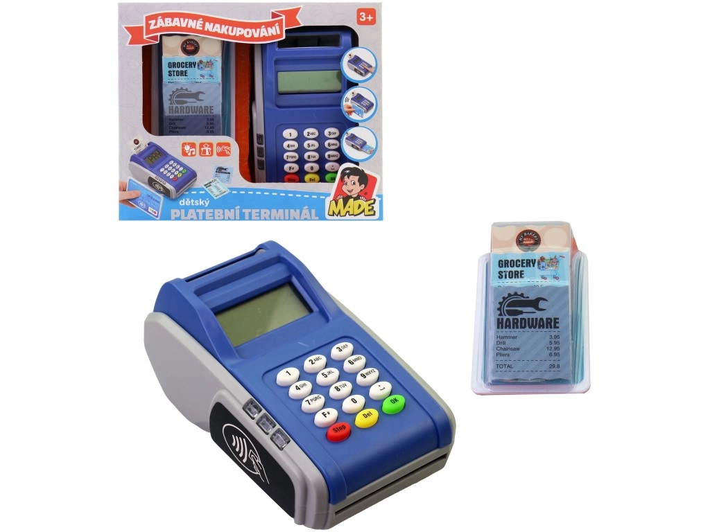 Otroški plačilni terminal spremeni vsako igro trgovine v realistično izkušnjo. Mali blagajniki lahko vnašajo zneske s pomočjo številčne tipkovnice, s funkcijo brezstičnega plačila »prislonijo« kartico ter vadijo komunikacijo in računanje. Kompaktne mere 17 × 14 × 6,5 cm se prilegajo nahrbtniku ali otroški torbi, zato je terminal primeren za doma, na poti in v vrtcu.