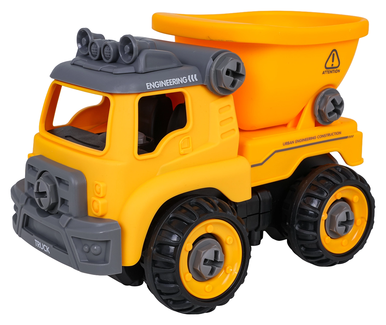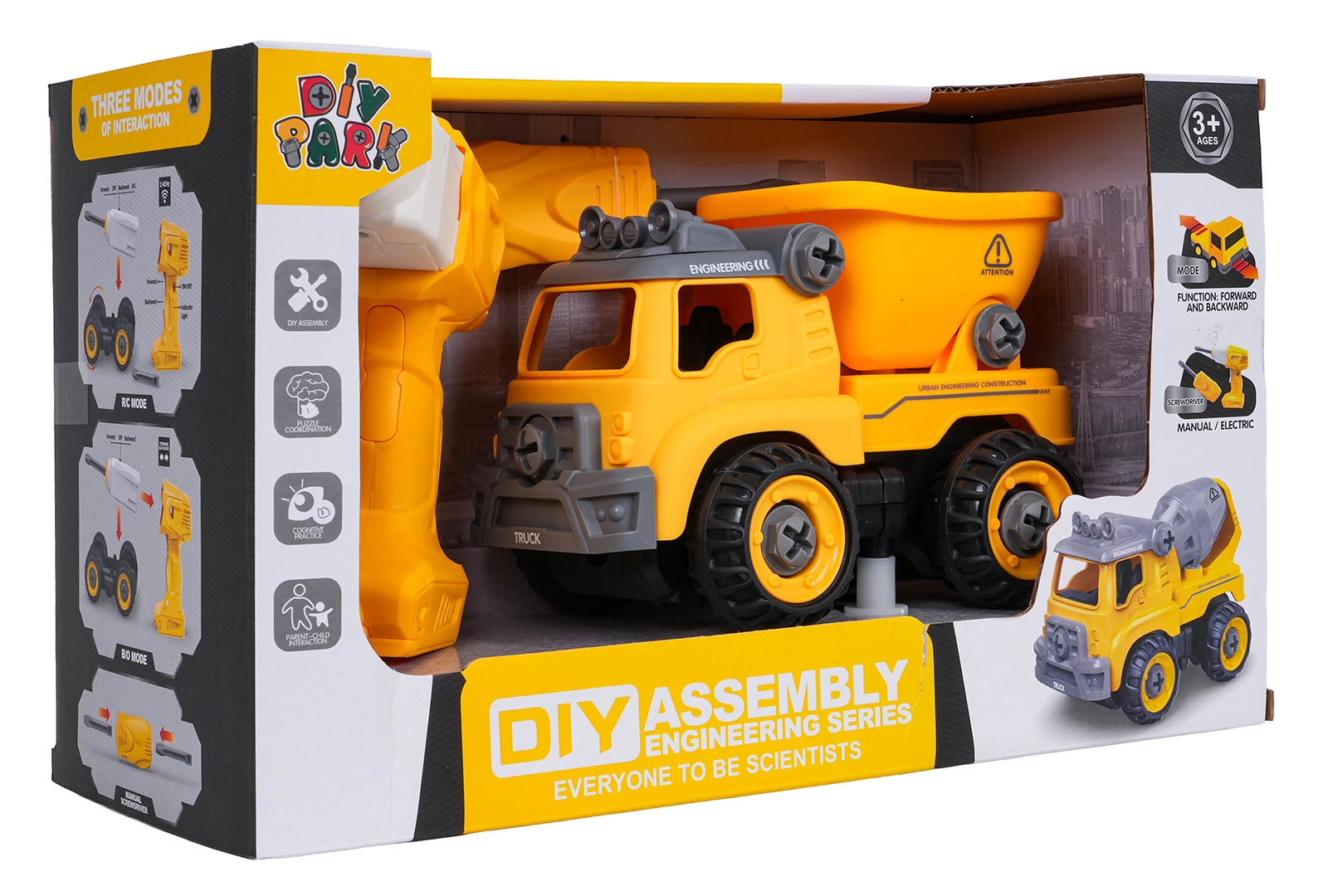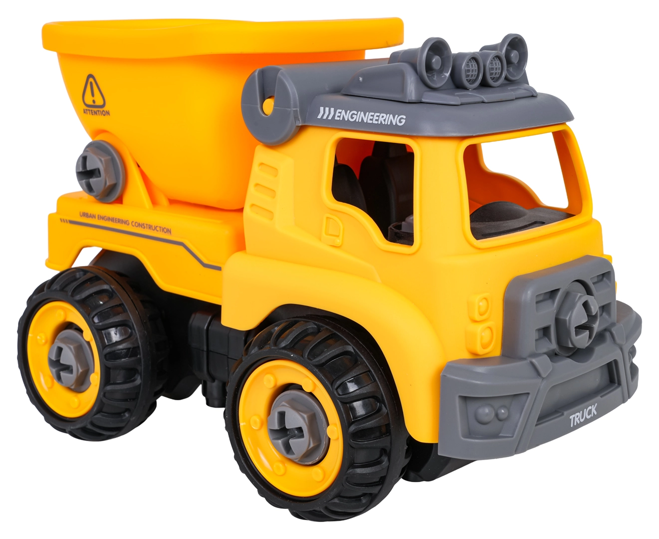 Zabaven razstavljiv gradbeni tovornjak za otroke od 3 let z baterijskim vrtalnikom in ročnim izvijačem. Otroci lahko vozilo preprosto razstavijo in ponovno sestavijo, pri čemer vadijo fino motoriko, logično razmišljanje in kreativnost. Po vstavitvi krmilne plošče se avto sam premika naprej in nazaj, ne manjkata prekucna kesonska korba in odpirajoča se streha.