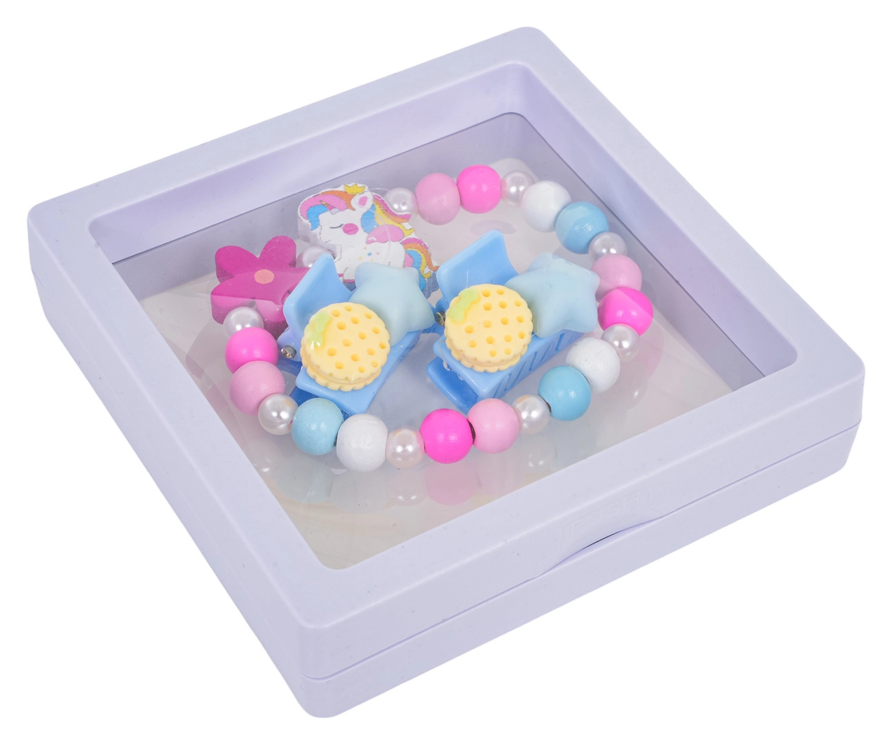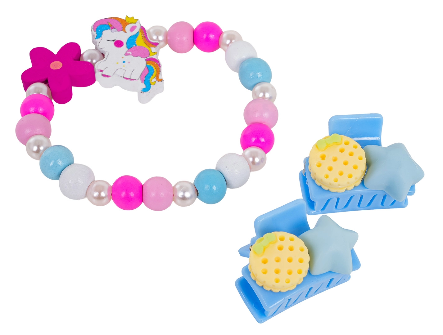 Zaradi kompaktnih mer se komplet udobno prilega v nahrbtnik ali predal in je pripravljen za igro doma in na poti. Popolna izbira za male ljubiteljice barv in ljubkih motivov, ki želijo uskladiti zapestnico in pričesko v en sam slog.