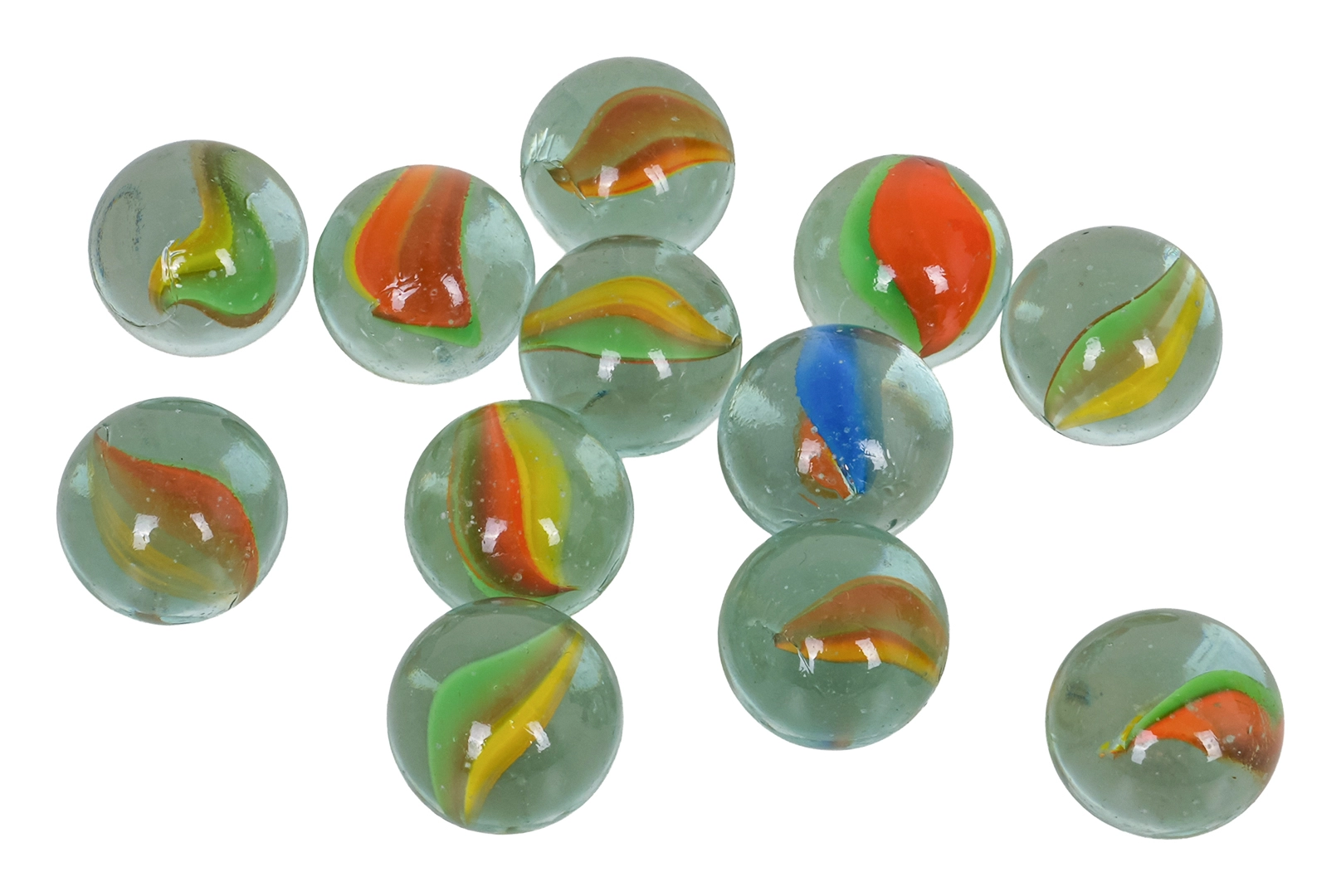 V paketu je 12 steklenih kroglic z barvnimi vzorci – idealno za dirke, časovne izzive in eksperimente z gravitacijo.