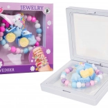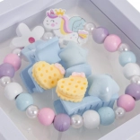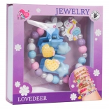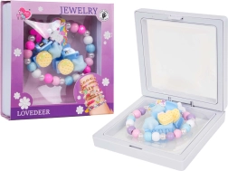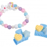 Ta čudovit komplet za otroke združuje igriv motiv enorožca z nežnimi barvami in prijetnimi materiali. Zapestnica je izdelana iz raznobarvnih lesenih kroglic in biserčkov, dopolnjuje pa jo ljubek obesek enorožca. Dva praktična sponkica dopolnita vsako pričesko in spodbujata domišljijo pri igri.