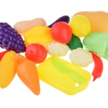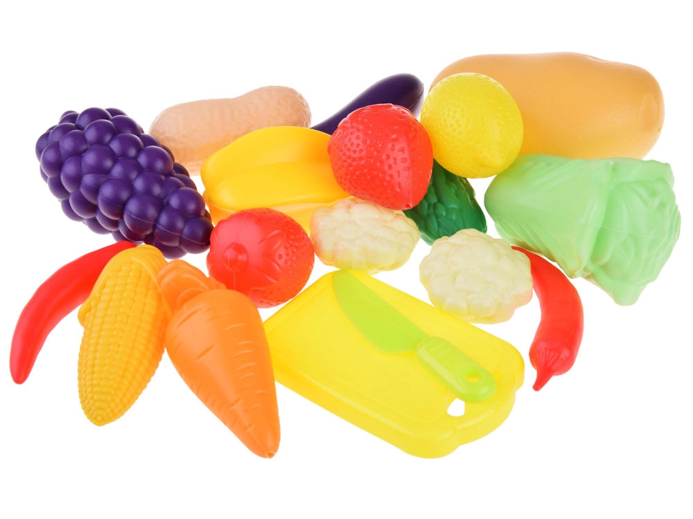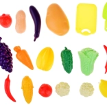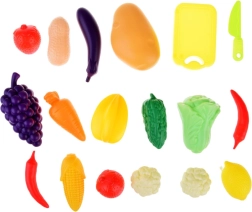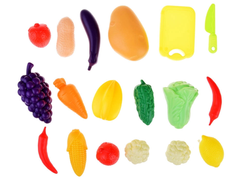 Raznolike oblike in barve spodbujajo domišljijo, učenje poimenovanja živil ter vloge prodajalca ali kupca.