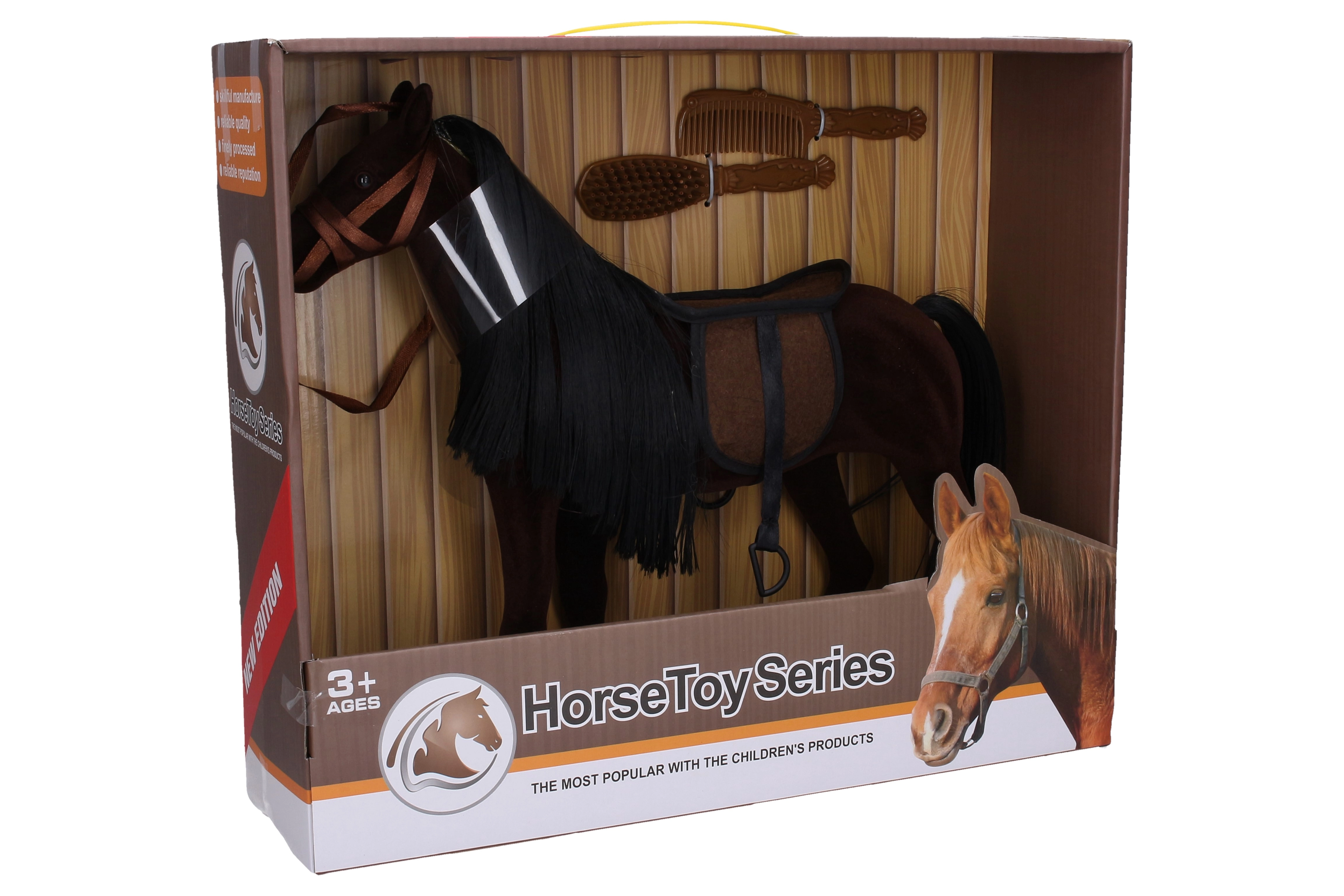 Prisrčen plišasti konj v temni barvi, velikosti 35 cm, bo razveselil vsakega malega ljubitelja konj. Del paketa sta sedlo in dva glavnika za enostavno česanje in nego. Idealna igrača za razvijanje domišljije in fine motorike. Mehek material, realistični detajli in praktični dodatki zagotavljajo veliko zabave doma in na poti.