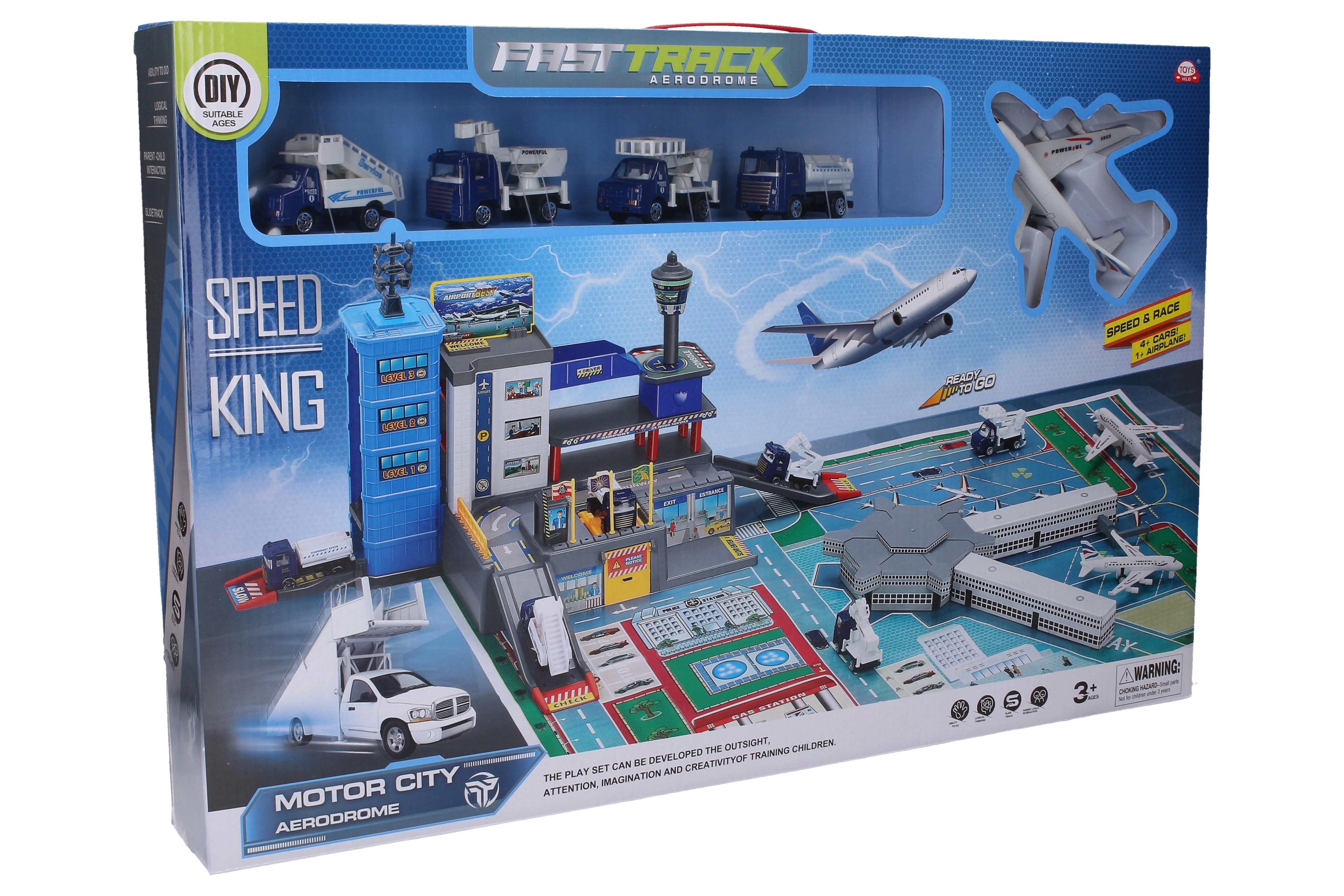 - Kompleten set – letališka garaža/ploščad, 4 kovinski avtomobilčki, 1 kovinsko letalo