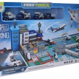 Zgradite si lastno živahno letališče doma! Ta set prinaša vse, kar otroci potrebujejo za napete prizore iz letalskega prometa – od pristajanja letal do premikanja servisnih vozil po ploščadi. Kovinski avtomobilčki in letalo delujejo realistično, prostotekajoča kolesa pa poskrbijo za gladko in zabavno igro.