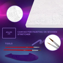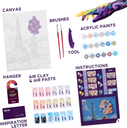 Vse potrebno najdete v paketu – od platna, samostrditvene mase do barv in čopiča. Dovolj je, da razpakirate in začnete ustvarjati. Težavnost 4/5 je odlična za tiste, ki si želijo izziv in hkrati jasen rezultat.
