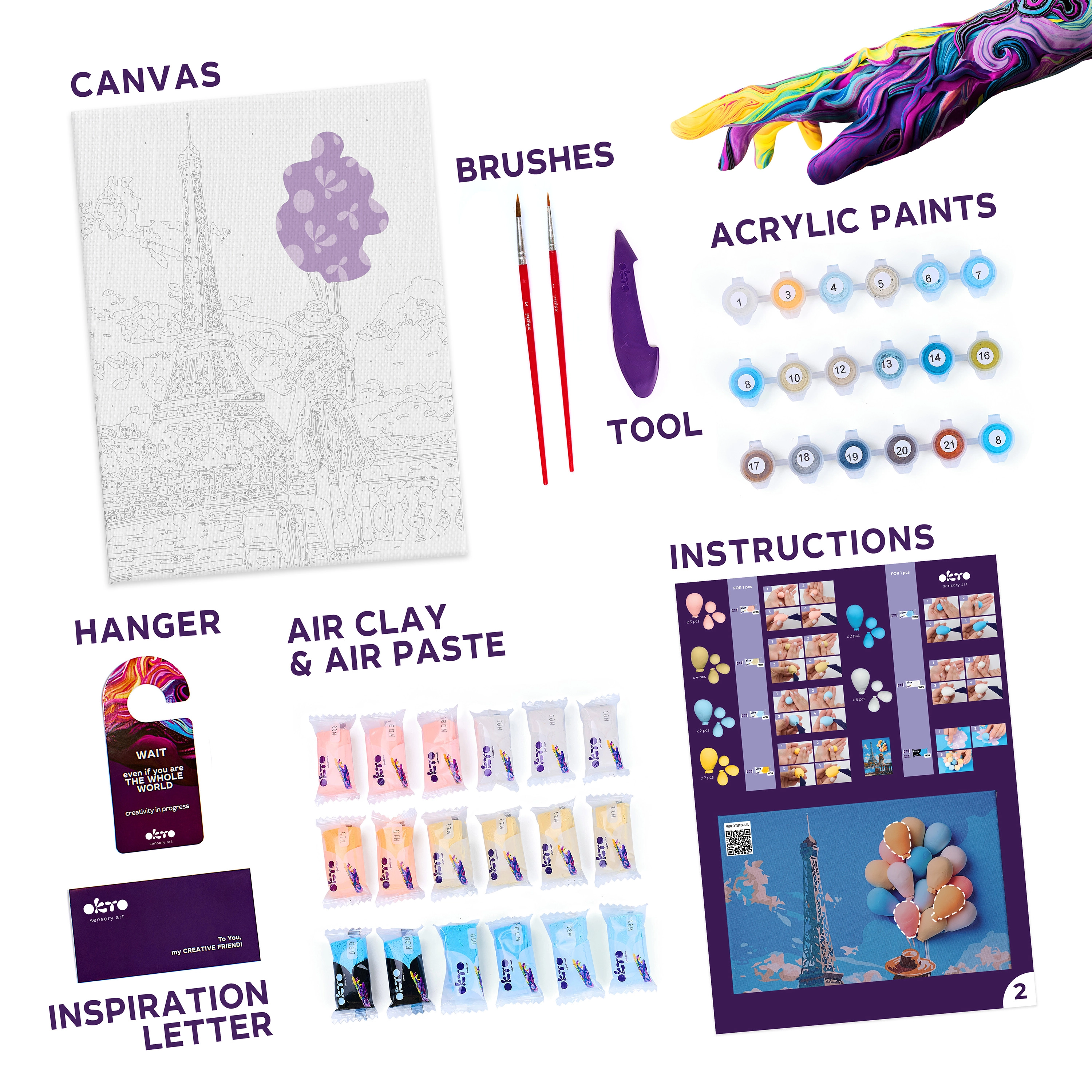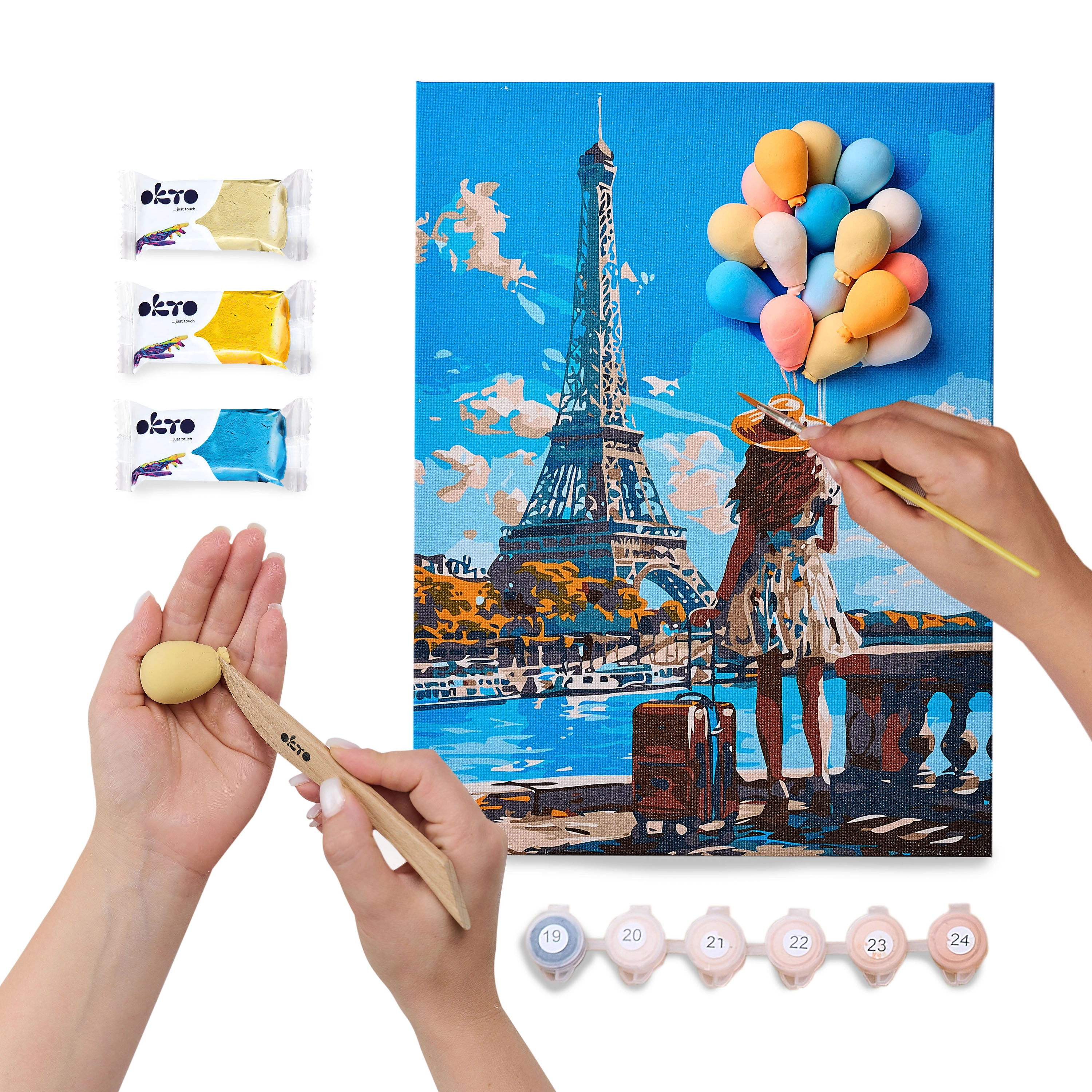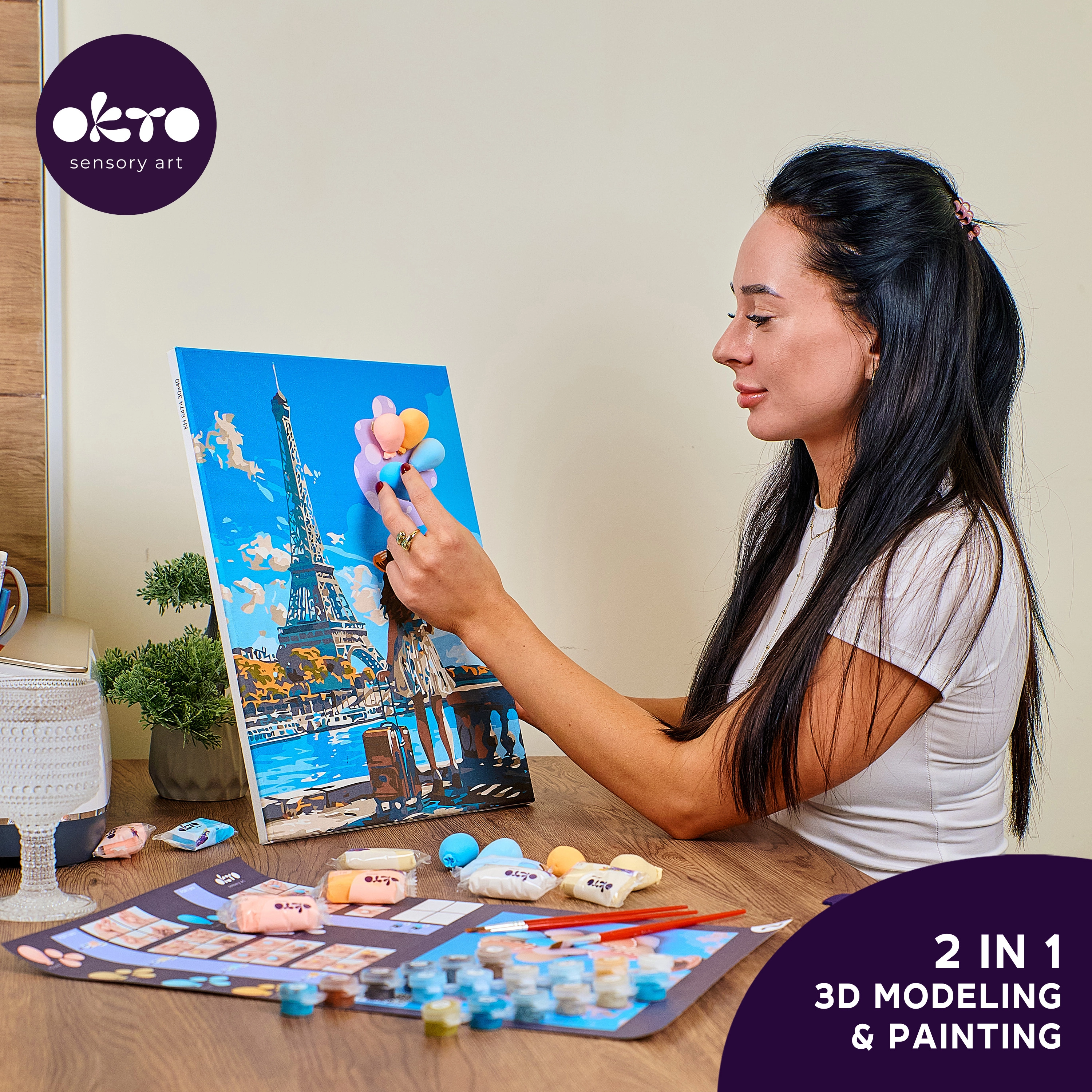 Ta kreativni komplet OKTO združuje slikanje z 3D modeliranjem, zato boste doma ustvarili edinstveno sliko z motivom Pariza. S predlogo in navodili korak za korakom boste dosegli plastične elemente, ki sliki dodajo globino in slog. Idealno kot darilo in dekoracija za interier.