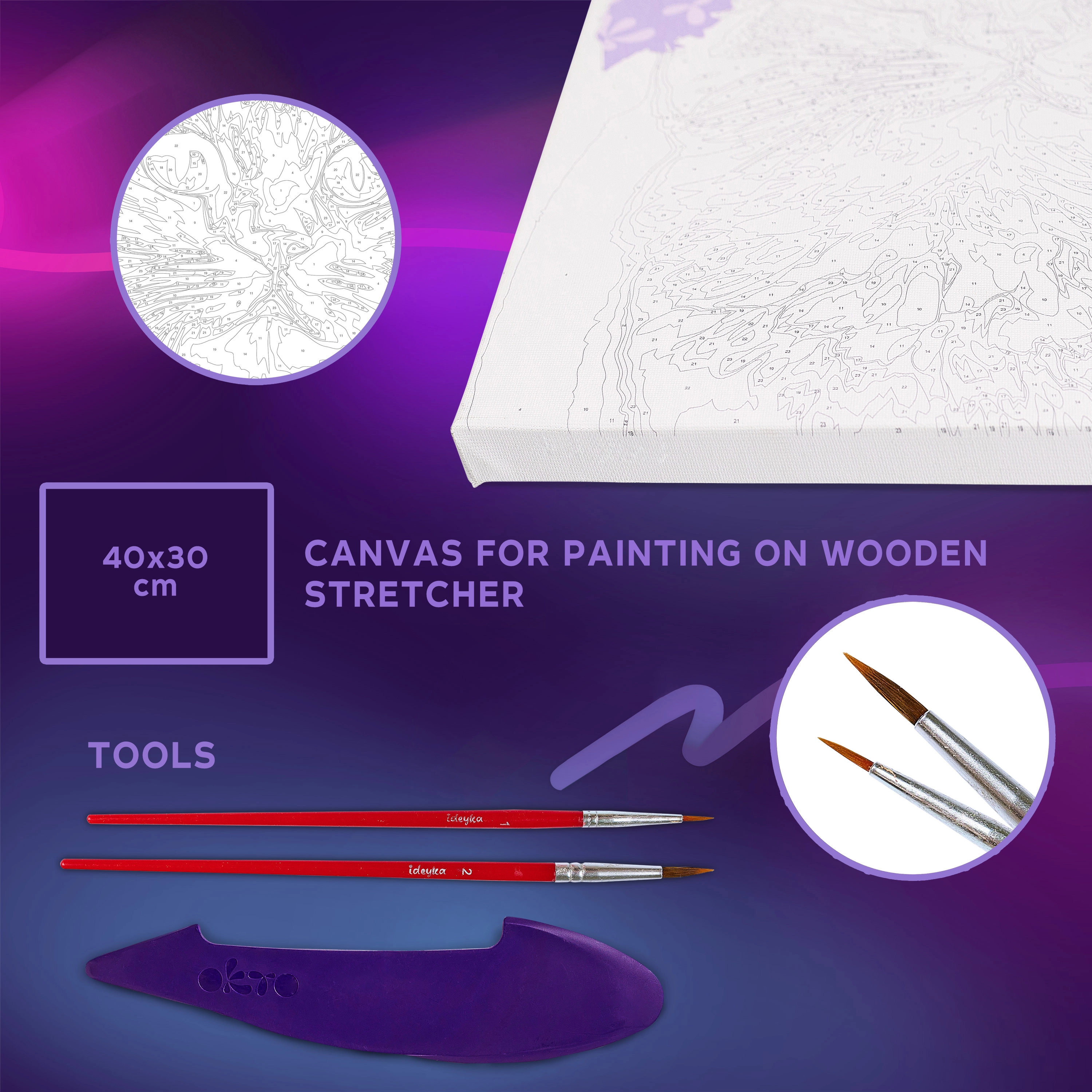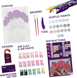 Komplet je popoln – od platna, barv in modelirnega orodja do preglednega slikovnega navodila. Zahvaljujoč formatu 30 × 40 cm imate dovolj prostora za ustvarjalni izraz in natančno obdelavo. Zahtevnost 4/5 je odlična izbira za srednje izkušene in napredne ustvarjalce.