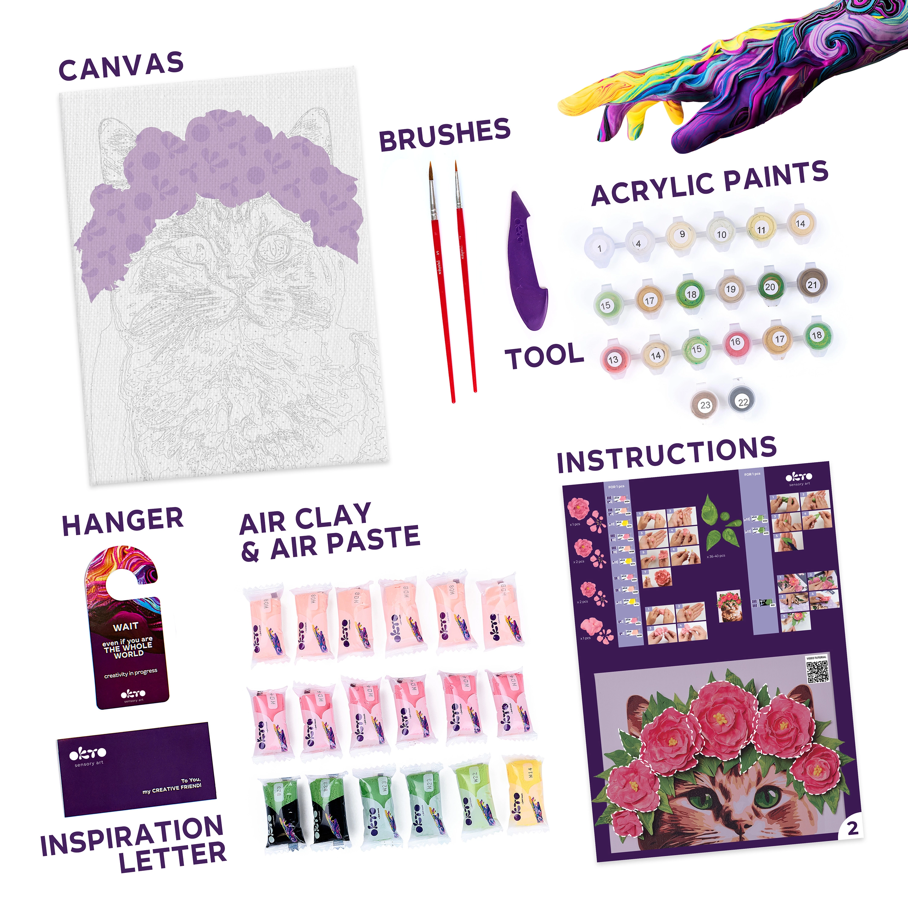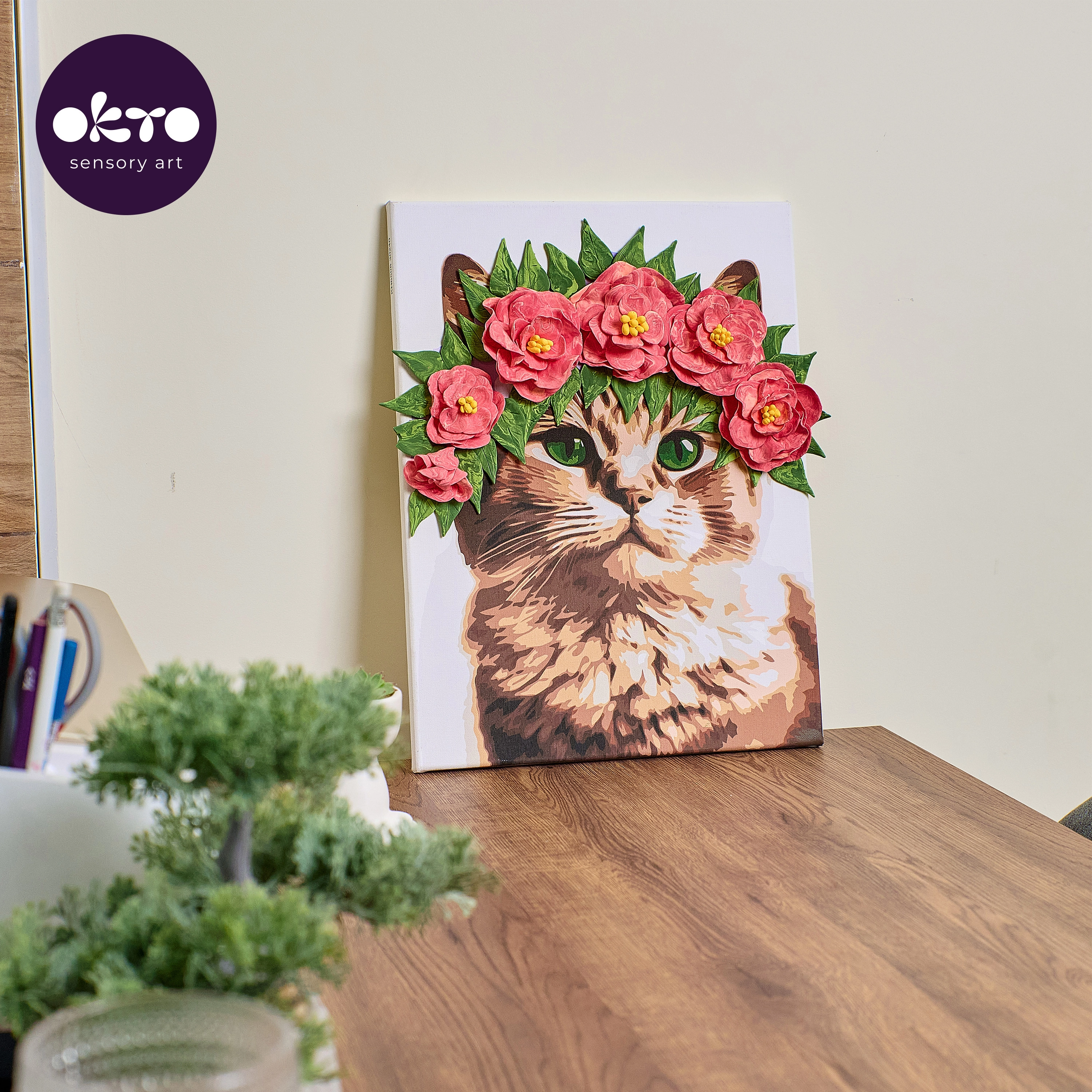 Odkrijte veselje do kombinacije slikanja in modeliranja z izvirno sliko OKTO. S samostrjujočo maso oblikujete plastične detajle cvetlične krone, s slikanjem pa jim dodate barve in globino. Rezultat je edinstvena dekoracija, ki izstopa v vsakem interierju.