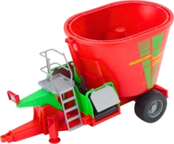 Rdeč mešalnik s platformo, lestevjo in izpustom omogoča odigrati realistične kmečke scenarije mešanja in razvoza krme.
