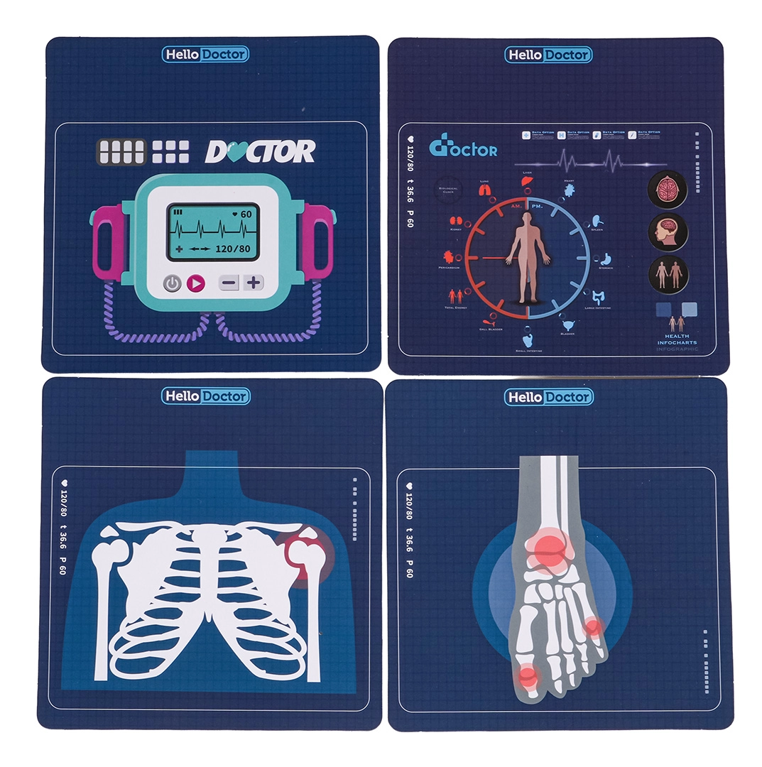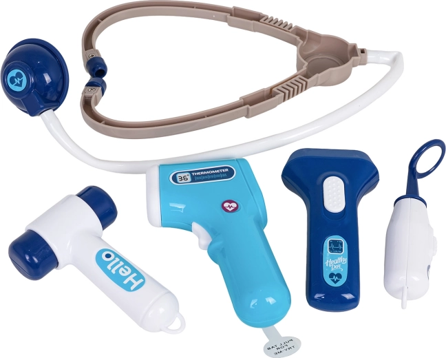 Stetoskop, brezkontaktni termometer z lučko, injekcija, škarje, pinceta, ogledalce, kladivce, očala, kartica pacienta in drugi dodatki za ustvarjalno igro.