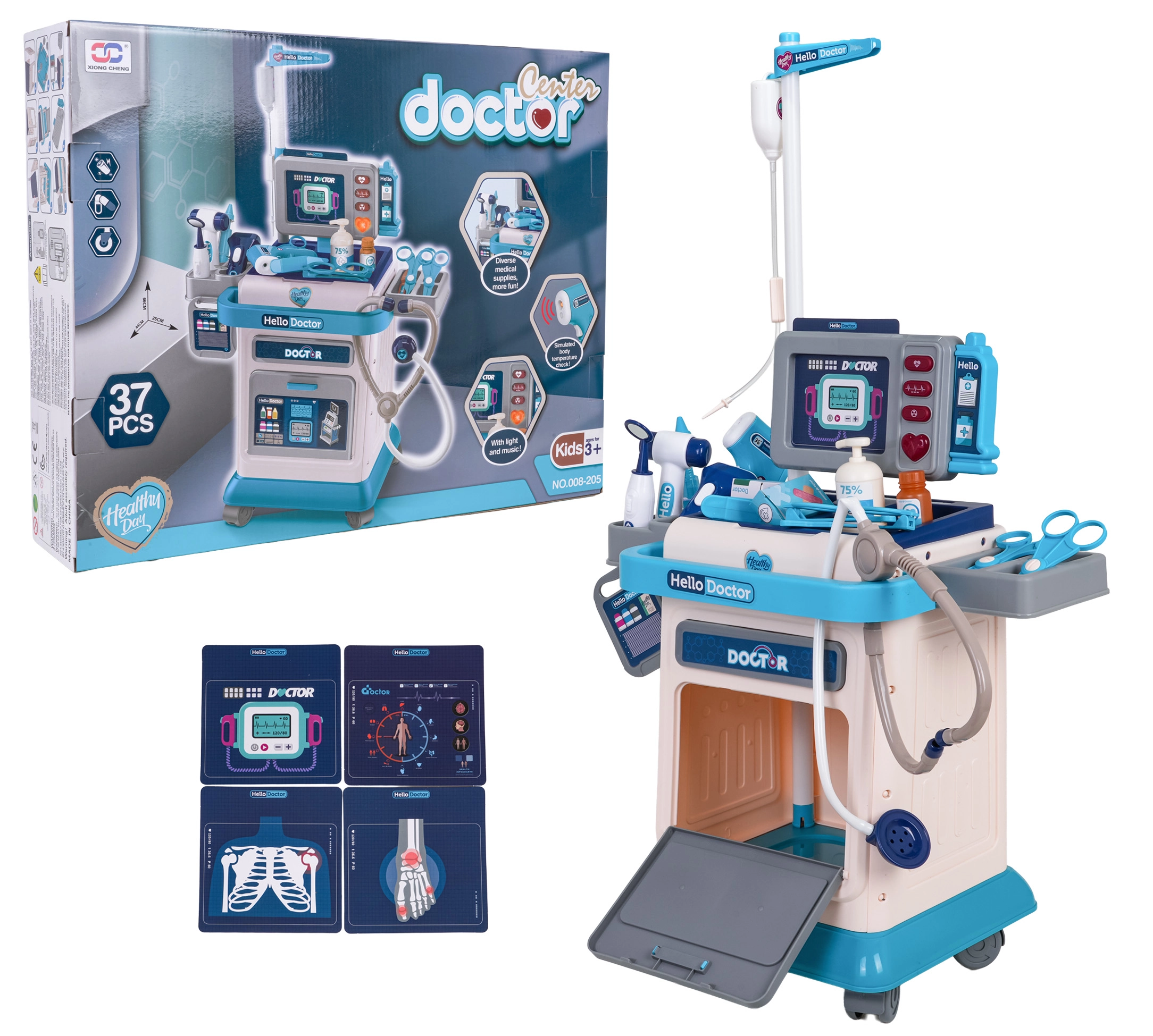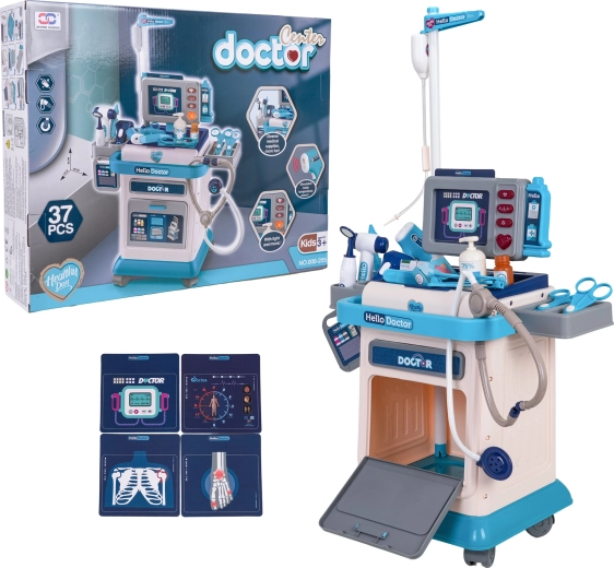 Ta bogato opremljen zdravniški set za otroke prinaša zabavno in poučno igro zdravnika. Stabilen voziček na kolesih z nastavljivim ročajem olajša prenos celotne ordinacije, medtem ko nadzorna plošča ponuja svetlobne in zvočne efekte – utrip srca, merjenje temperature, zvok tomografa in alarm. Priloženi so zamenljivi posnetki za EKG in tomograf, ki podpirajo realistično igro.