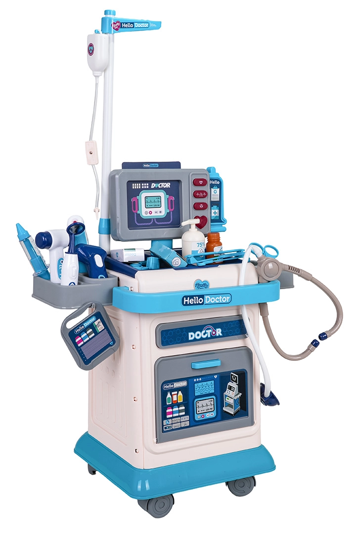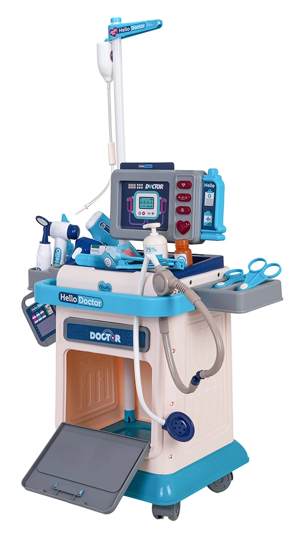 Otroci v setu najdejo vse potrebno: stetoskop, brezkontaktni termometer z lučko, injekcijo, škarje, pinceto, ogledalce, nevrološko kladivce, očala ter drobne dodatke, kot so kartica pacienta, steklenička z "razkužilom", škatlica z obliži in zdravili ter IV stojalo. Voziček ima praktičen predal in držala za urejeno shranjevanje orodij.