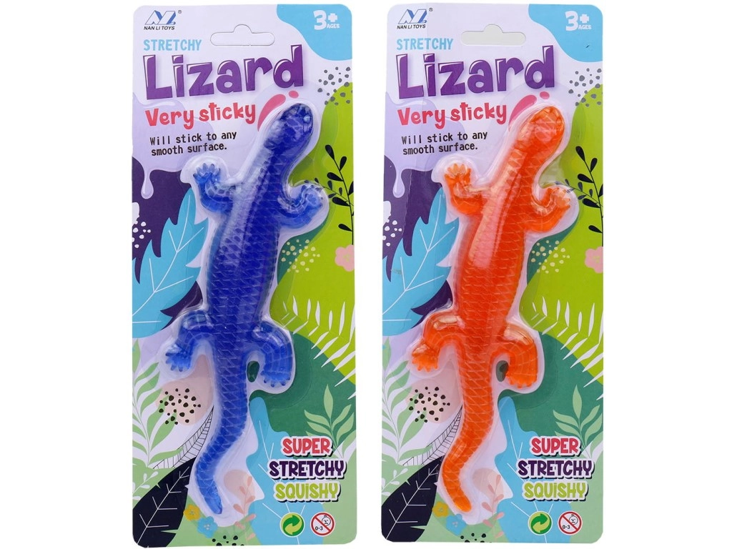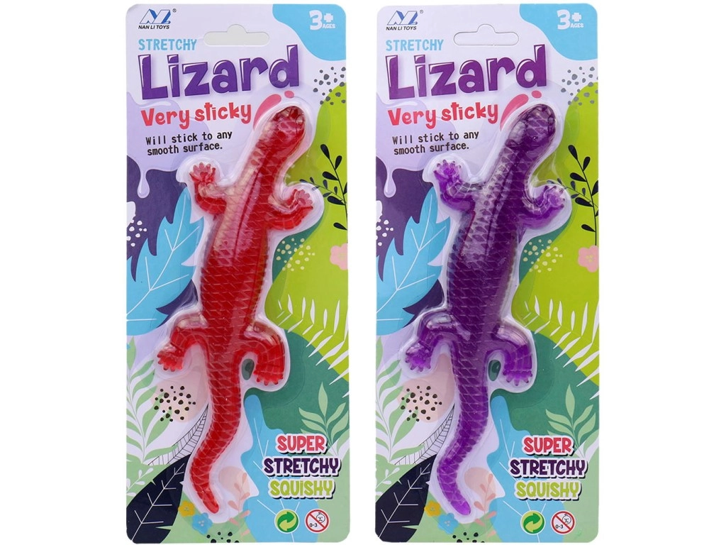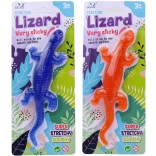 Zabaven lepljivi kuščar velikosti 19,5 × 6 cm za otroke od 3 let. Mehak plastičen material se zlahka oprime gladkih površin in zagotovi veliko zabave doma in na poti. Dobavljeno v blistru.