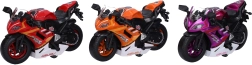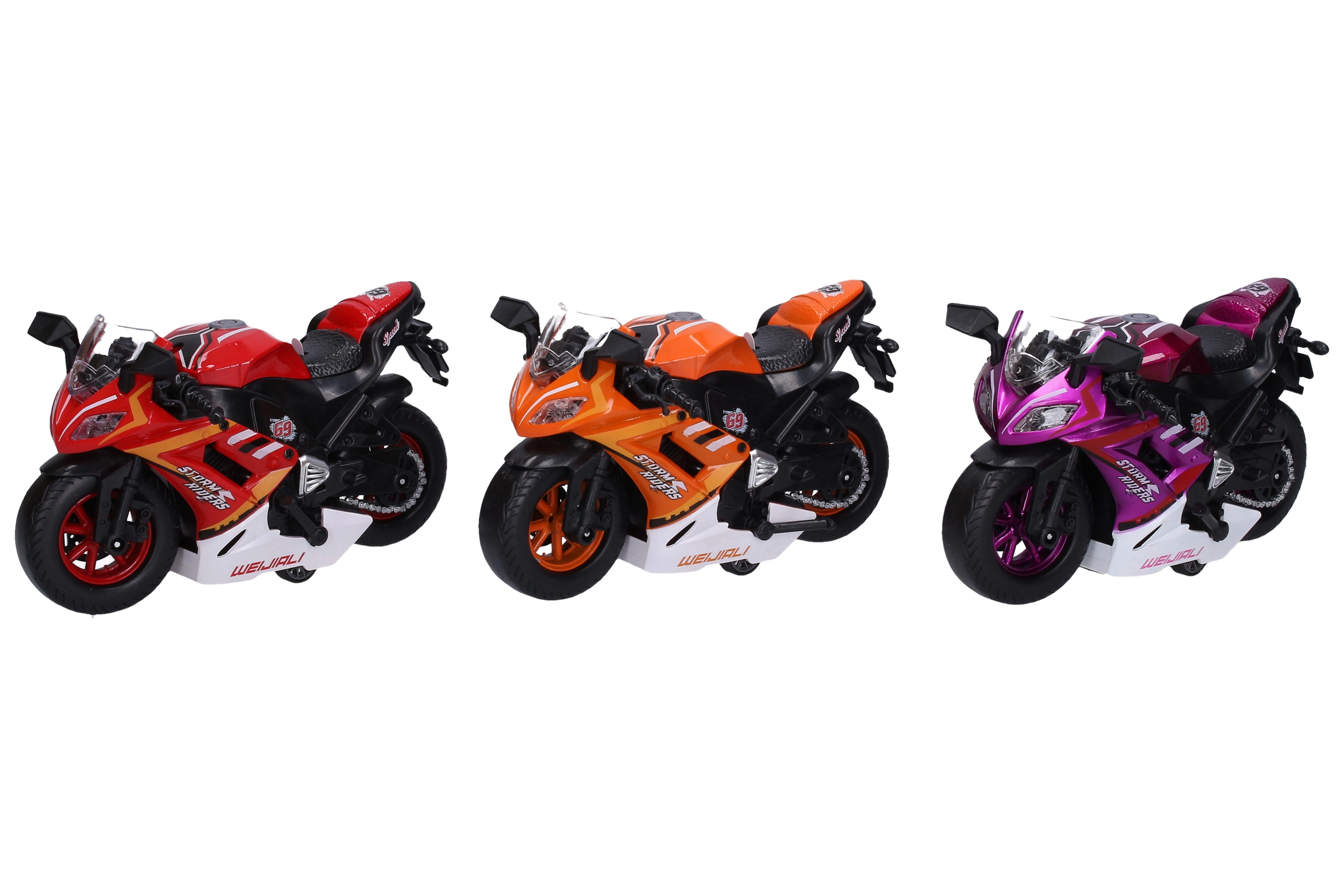 Zabavno motorno kolo na vzvratni navoj dolžine 16 cm prinaša veliko akcije za male dirkače. Ponuja svetlobne in zvočne učinke, na voljo je v različnih barvnih različicah in je zahvaljujoč priloženim 3× AG3 baterijam pripravljeno na vožnjo takoj po razpakiranju.