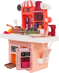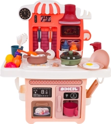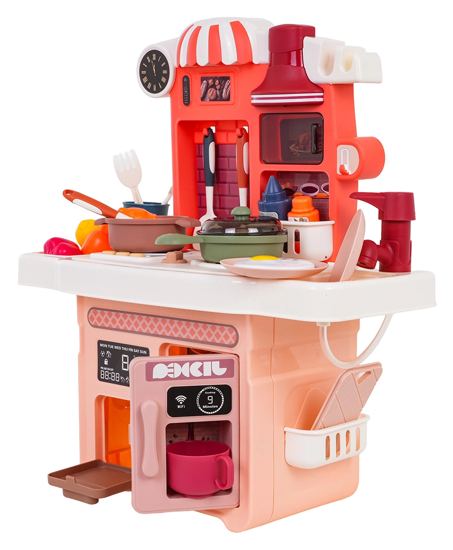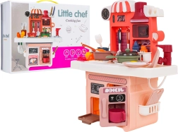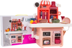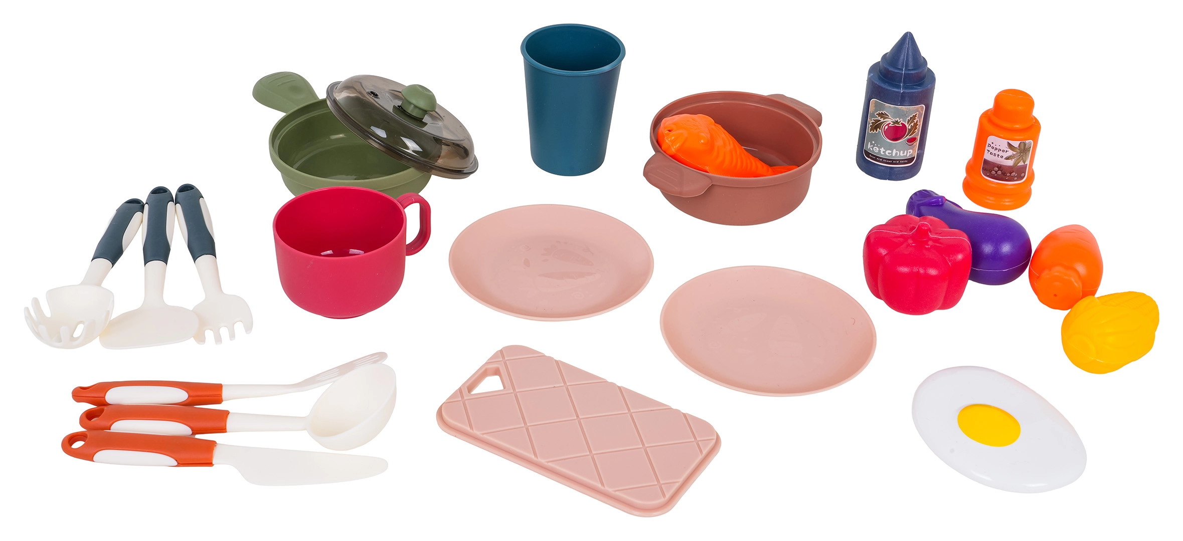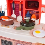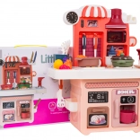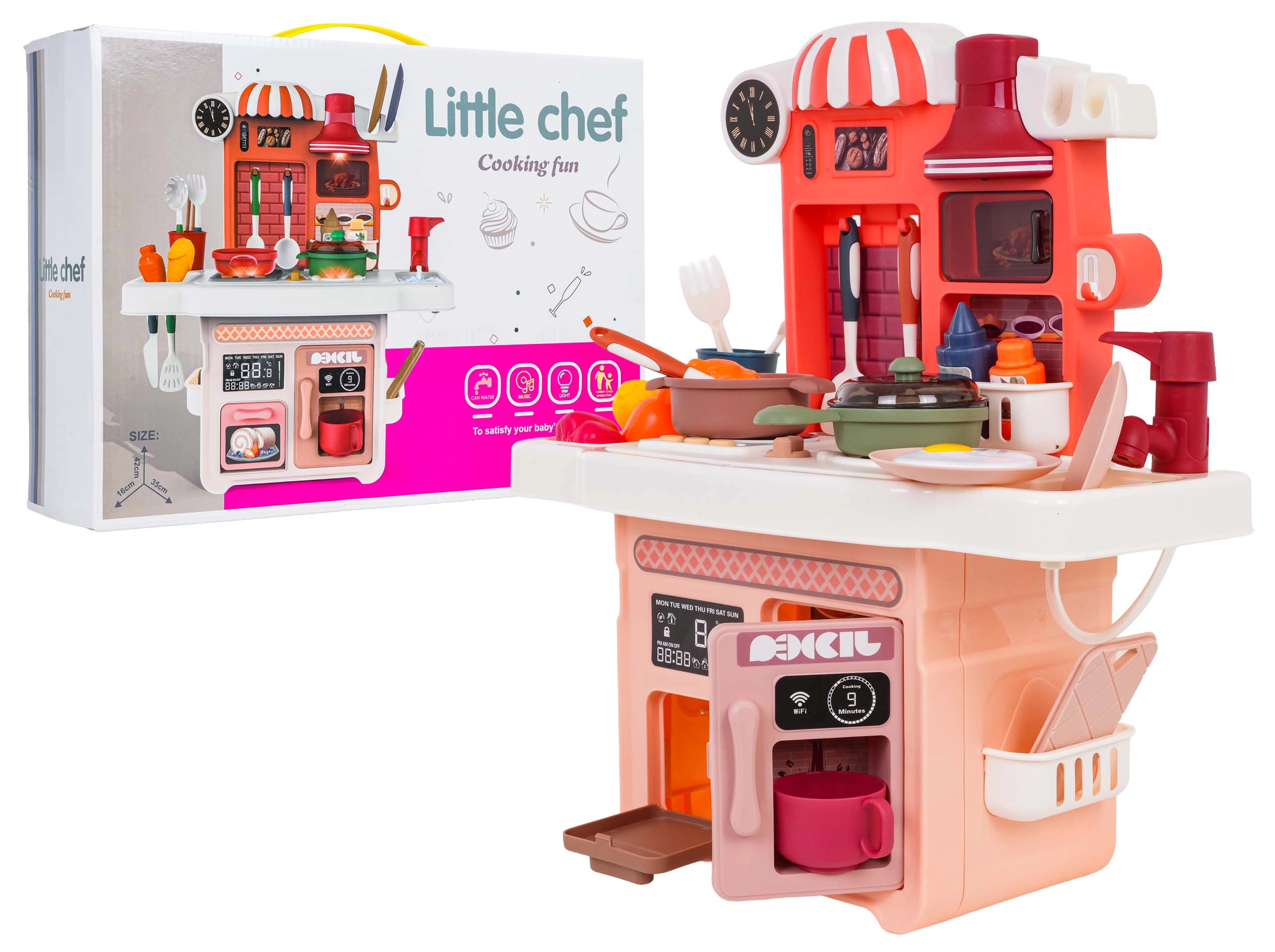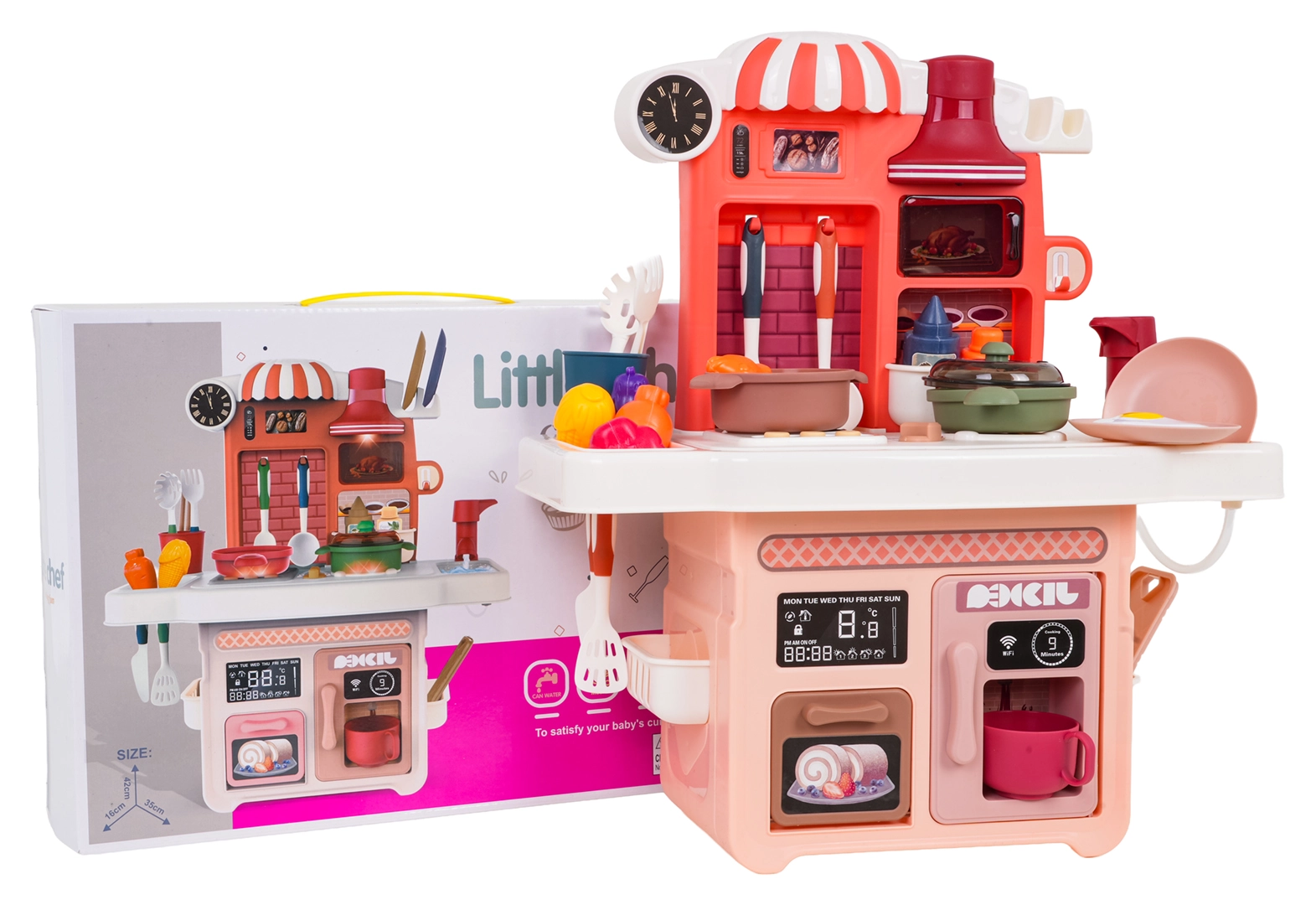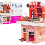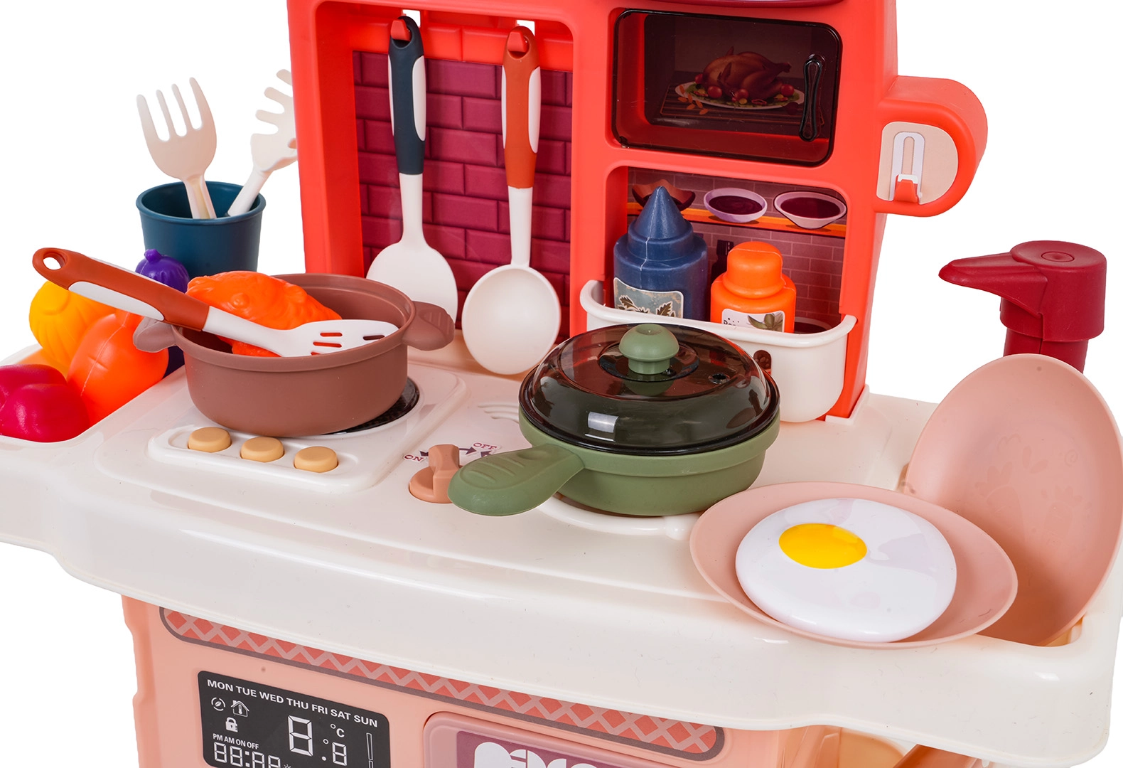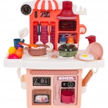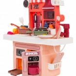 Prava atrakcija je delujoča pipa – iz baterijske črpalke teče voda v korito, tako da lahko otroci »pomivajo posodo« kot v pravi kuhinji. Del kompleta so tudi odpirajoča se pečica, imitacija kavnega aparata in osvetljen kuhinjski napo. Bogata dodatna oprema (lonci, ponev, pripomočki, krožniki in živila) širi možnosti igre.