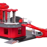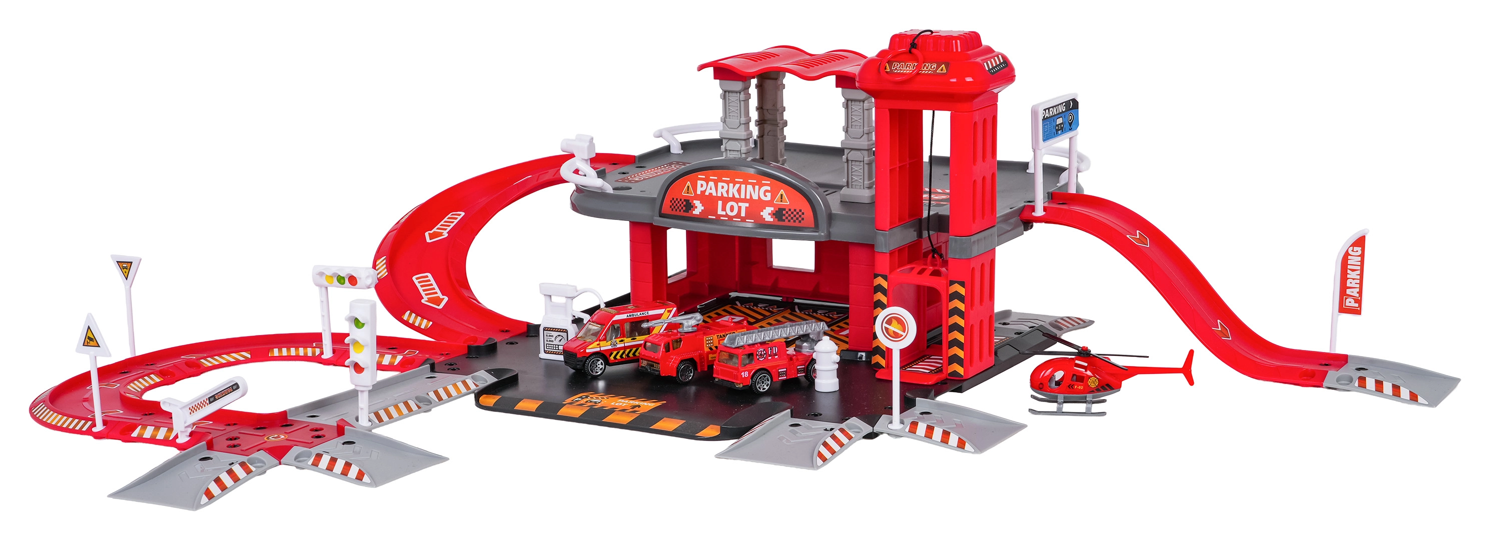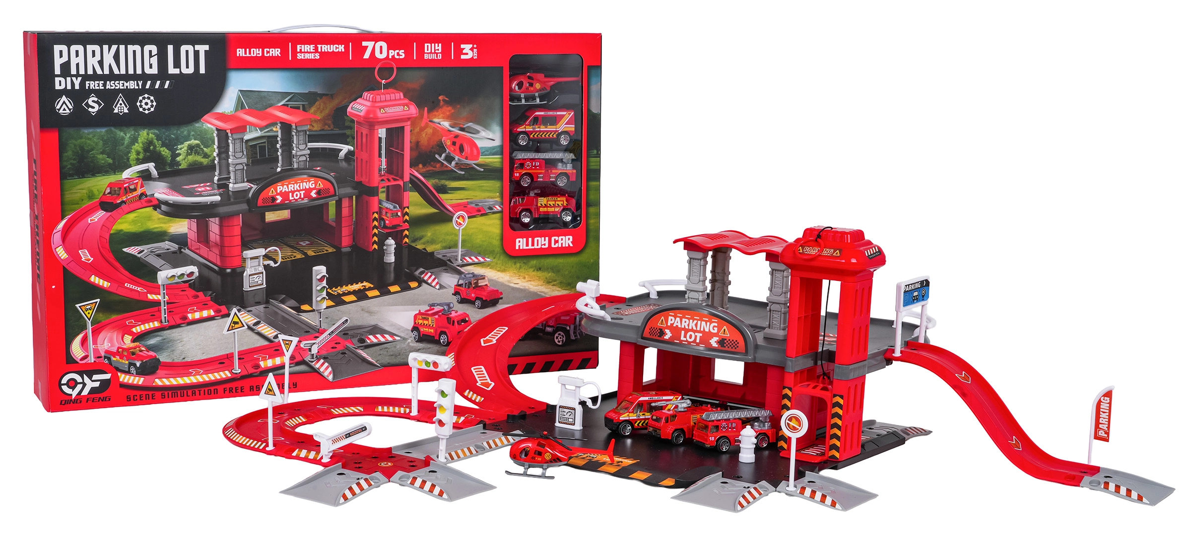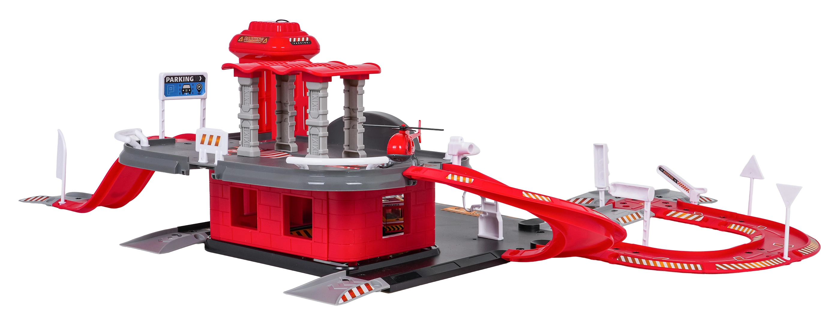 Ta podrobno izdelan komplet gasilske postaje združuje zabavo in razvoj veščin. Otroci lahko točijo gorivo na bencinski črpalki, vozijo po cesti, z ročnim dvigalom zapeljejo vozilo v nadstropje in parkirajo na označenih mestih. Iz zgornjega nadstropja se vozila vračajo z dvigalom ali se spustijo po spiralni rampi.