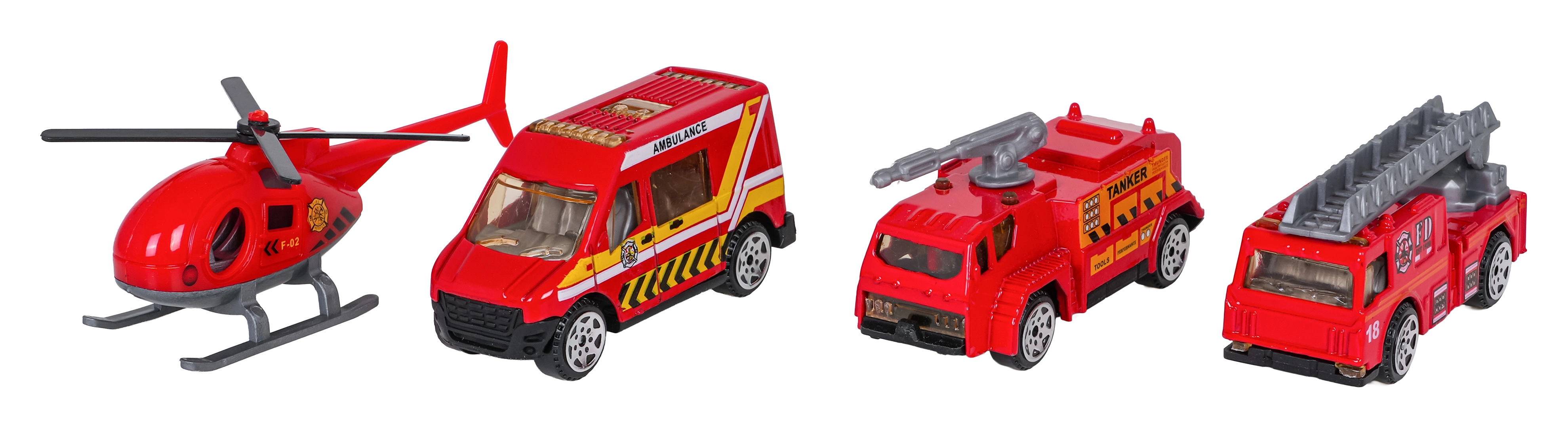Tri trpežni kovinski avtomobilčki s premičnimi deli in podroben helikopter razširjajo možnosti igre in povečujejo realističnost akcije.
