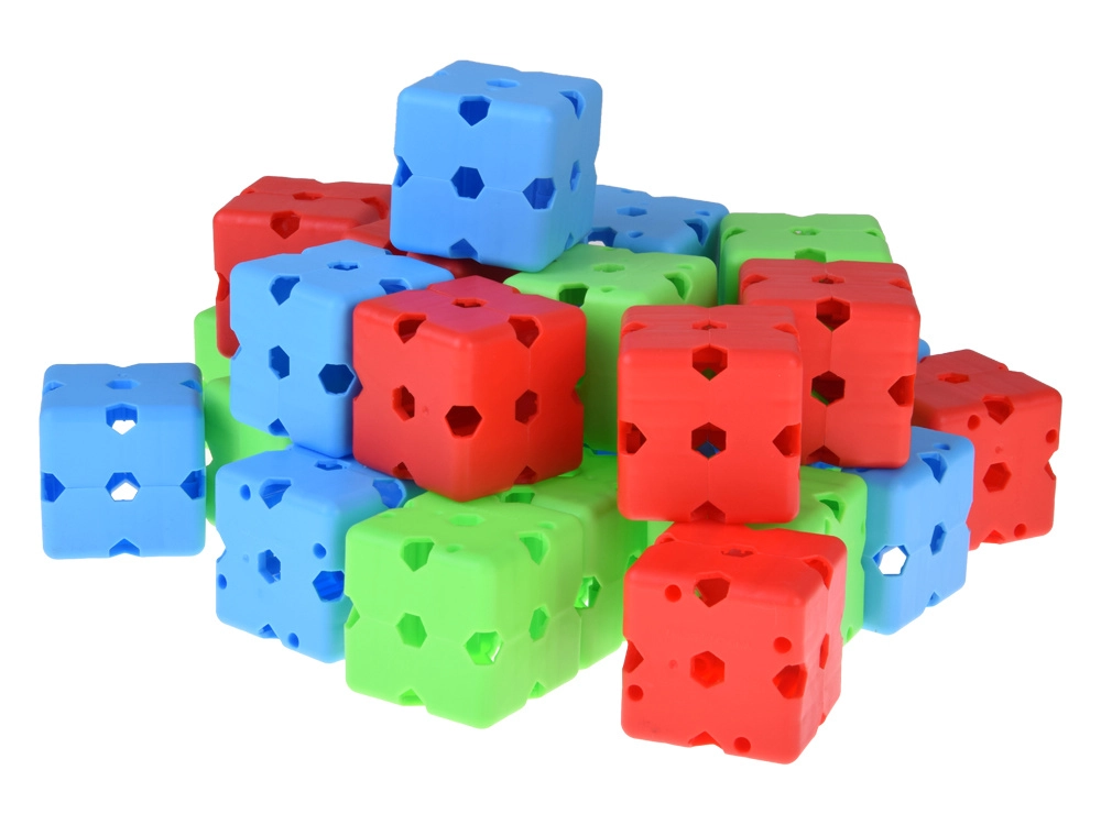 Barvite kocke z večsmernimi odprtinami omogočajo povezovanje paličic pod različnimi koti. Tako zlahka zgradite stolpe, kupole in prostorne igralne trdnjave.