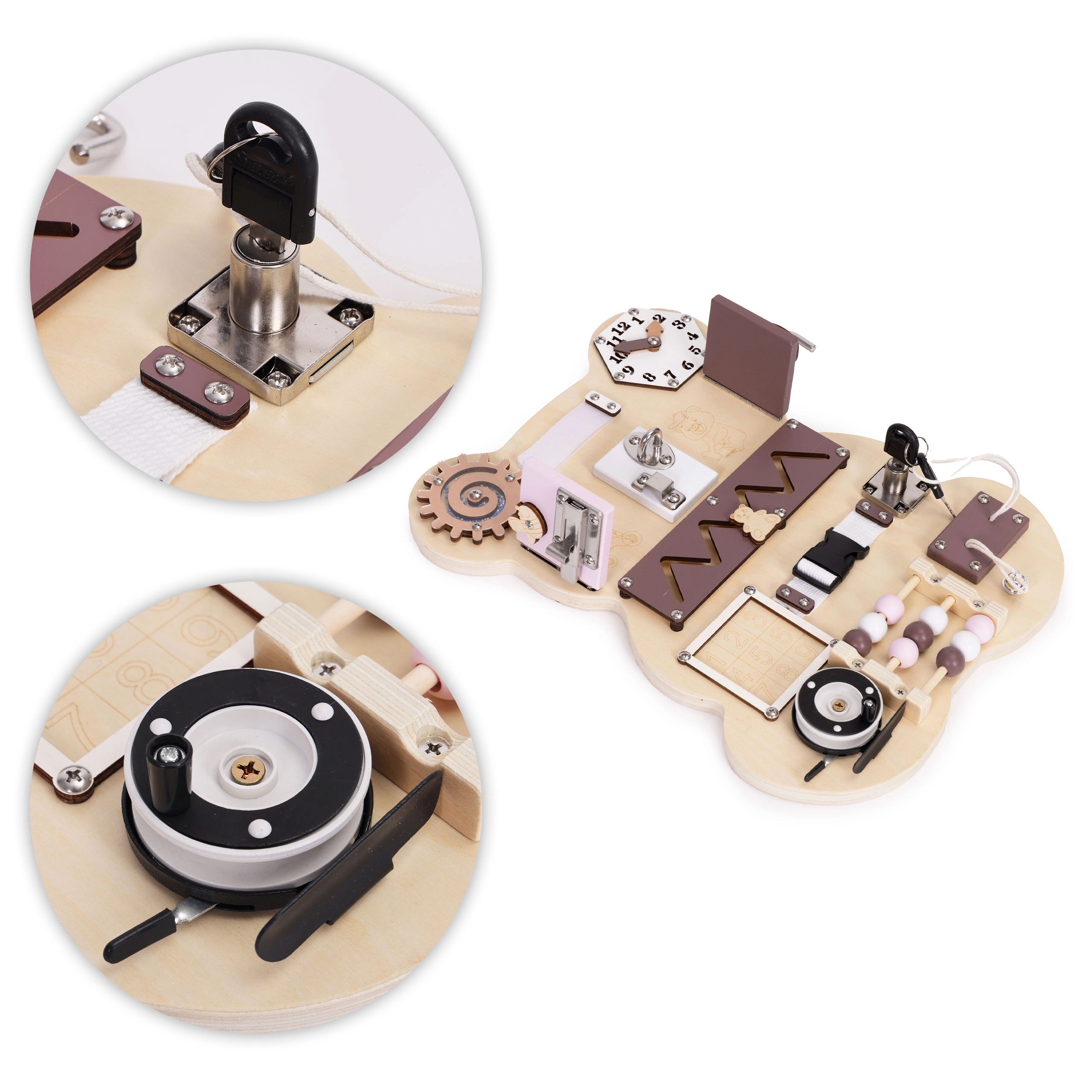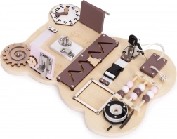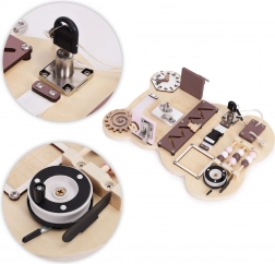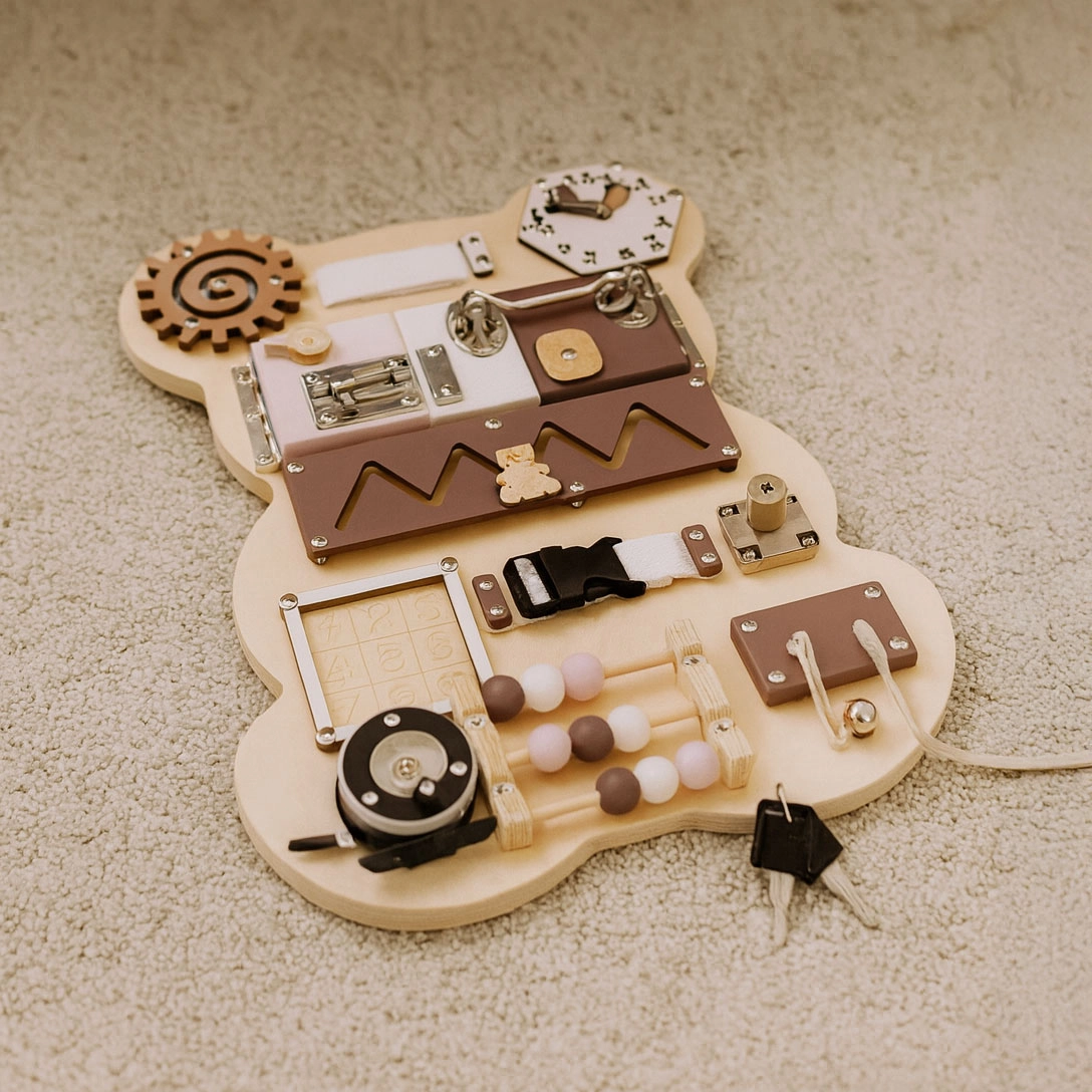 Busy board spodbuja senzorično stimulacijo in varno eksperimentiranje z mehanizmi, znanimi iz vsakdanjega življenja. Otroci se na igriv način urijo v štetju na krogličnem abakusu, razumejo načela vzrok–posledica in osvajajo praktične veščine, ki jih uporabijo tudi zunaj igre.