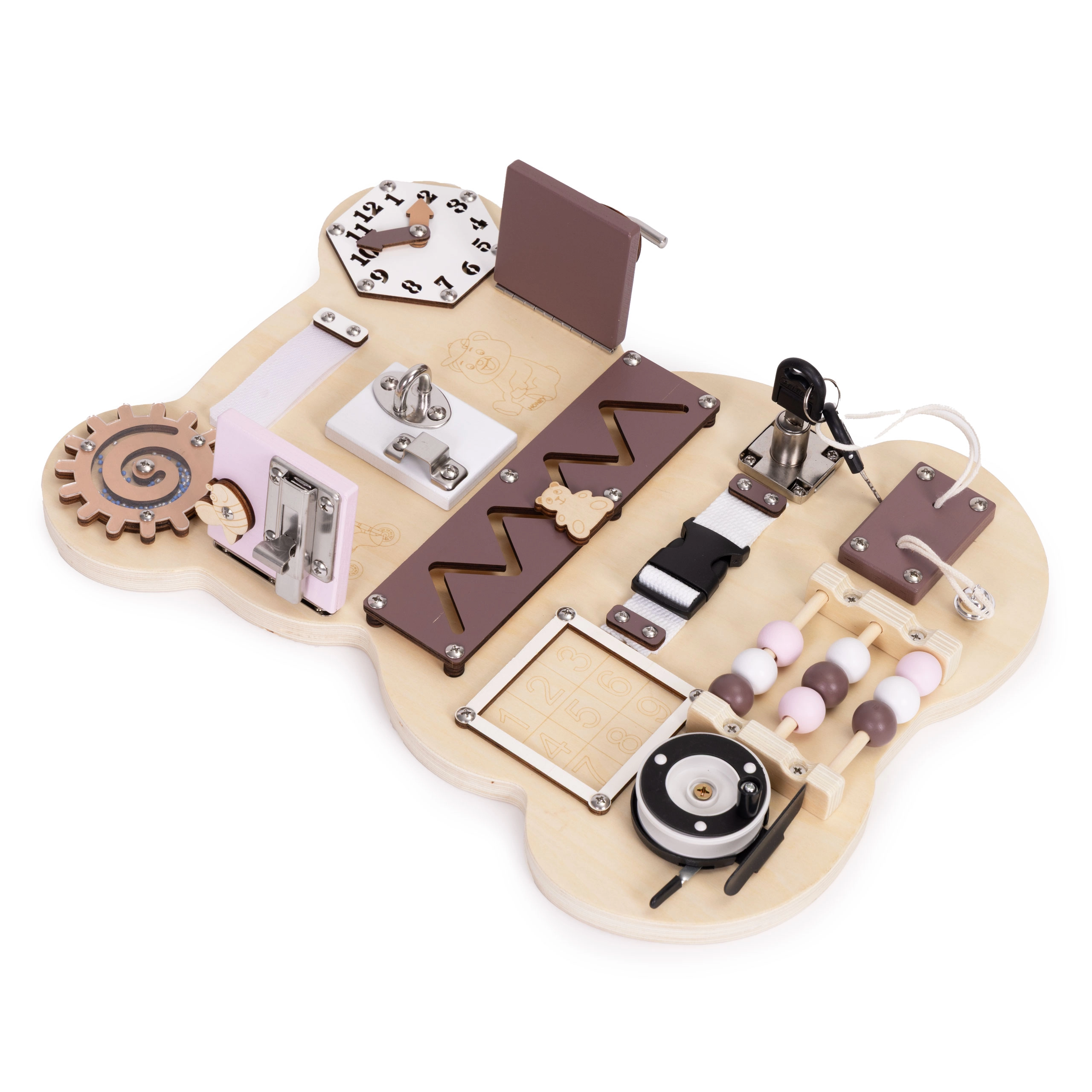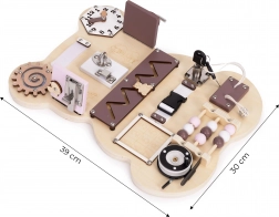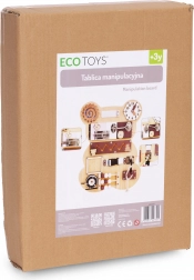 Lesena aktivna plošča ECOTOYS v obliki medvedka je premišljena izobraževalna igrača za otroke od 3 let. Zaradi kombinacije lesa, kovine in tekstilnih elementov otroci vadijo prijem, koordinacijo oko–roka ter potrpežljivost. Bogata paleta elementov – od ključavnice s ključem preko zobnikov do premične ure – naravno vodi k odkrivanju in razvija samostojnost.
