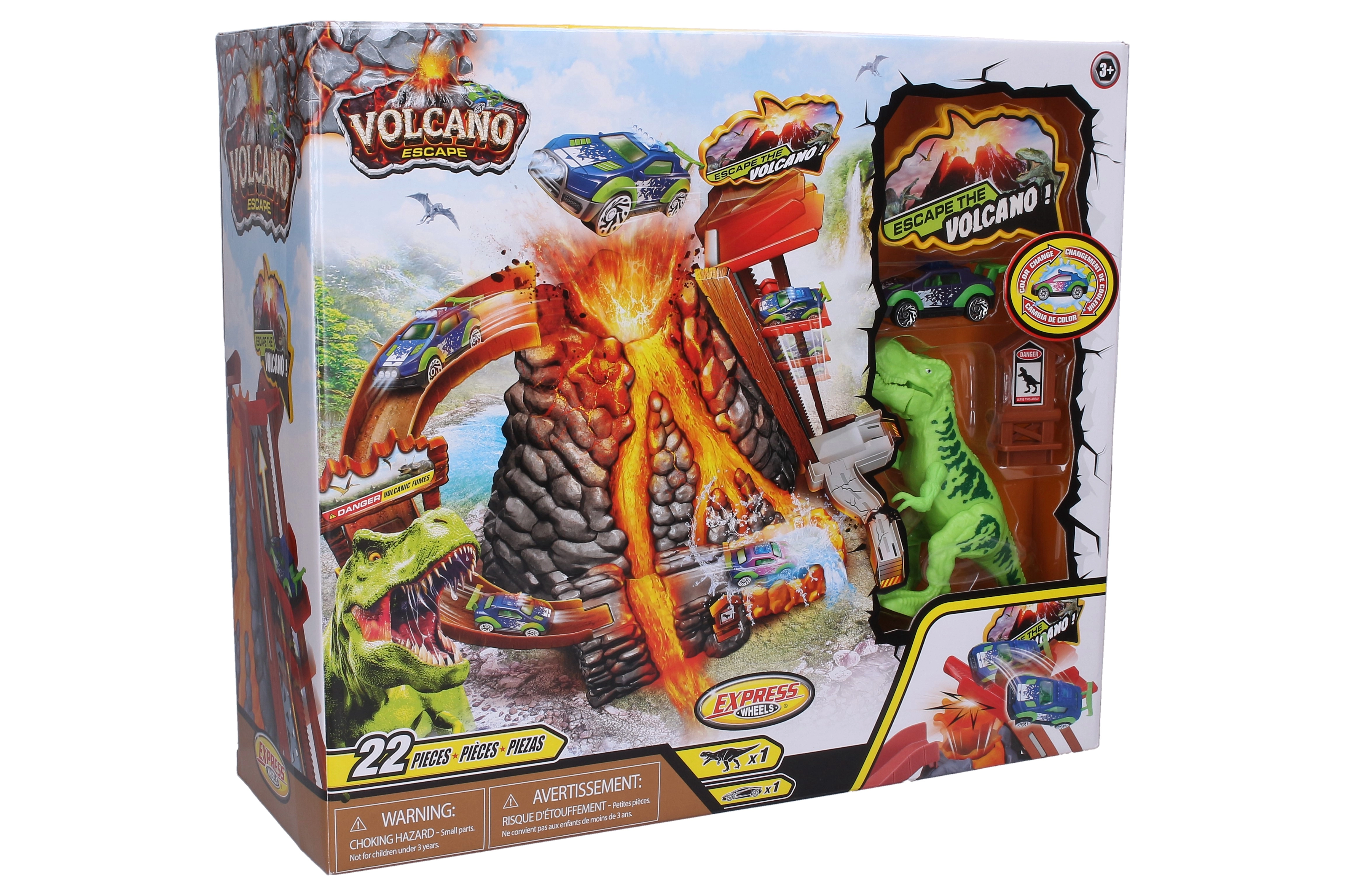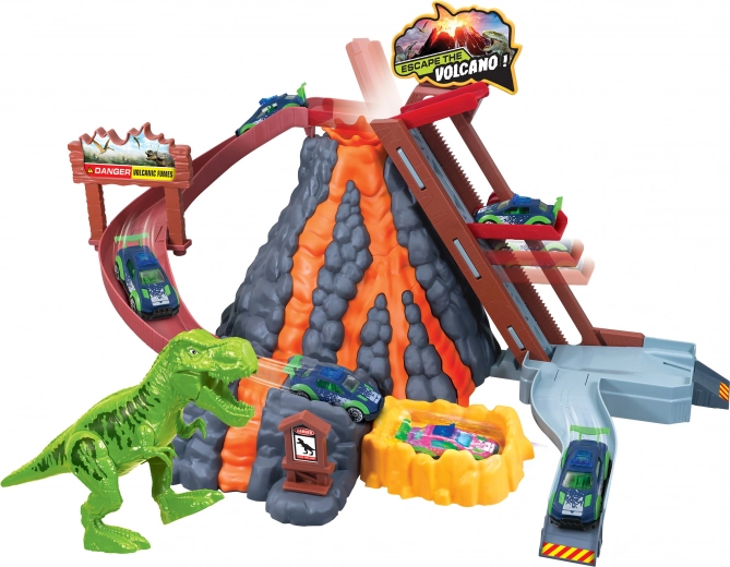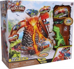 Ta zabavna avtocesta z vulkanom prinaša otrokom dinamično igro, polno presenečenj. Dvignite avtomobilček z dvigalom na vrh, spustite ga po klancu in opazujte, kako beži pred »lavo« iz vulkana. Nato ga potopite v pripravljeno vodno kopel in uživajte v takojšnji spremembi barve.