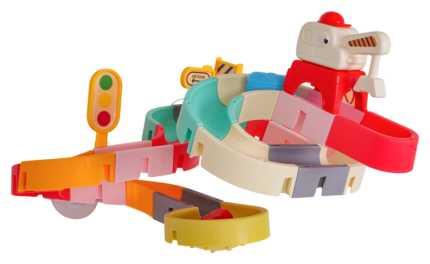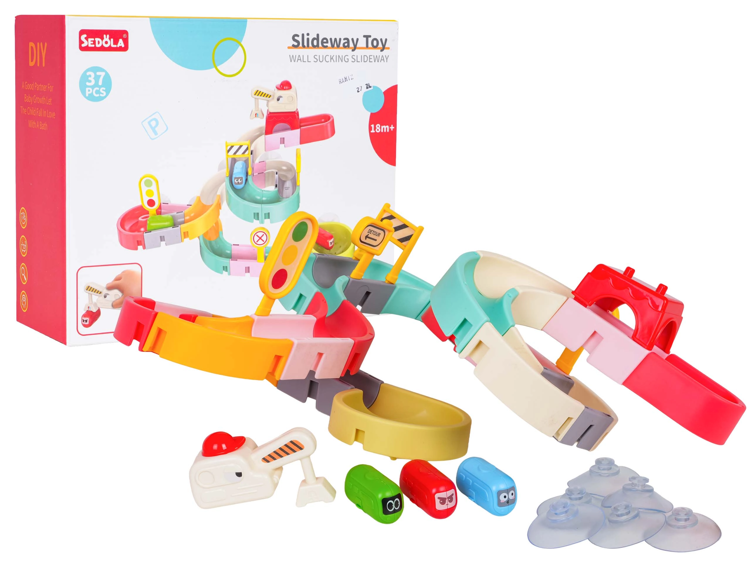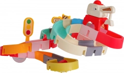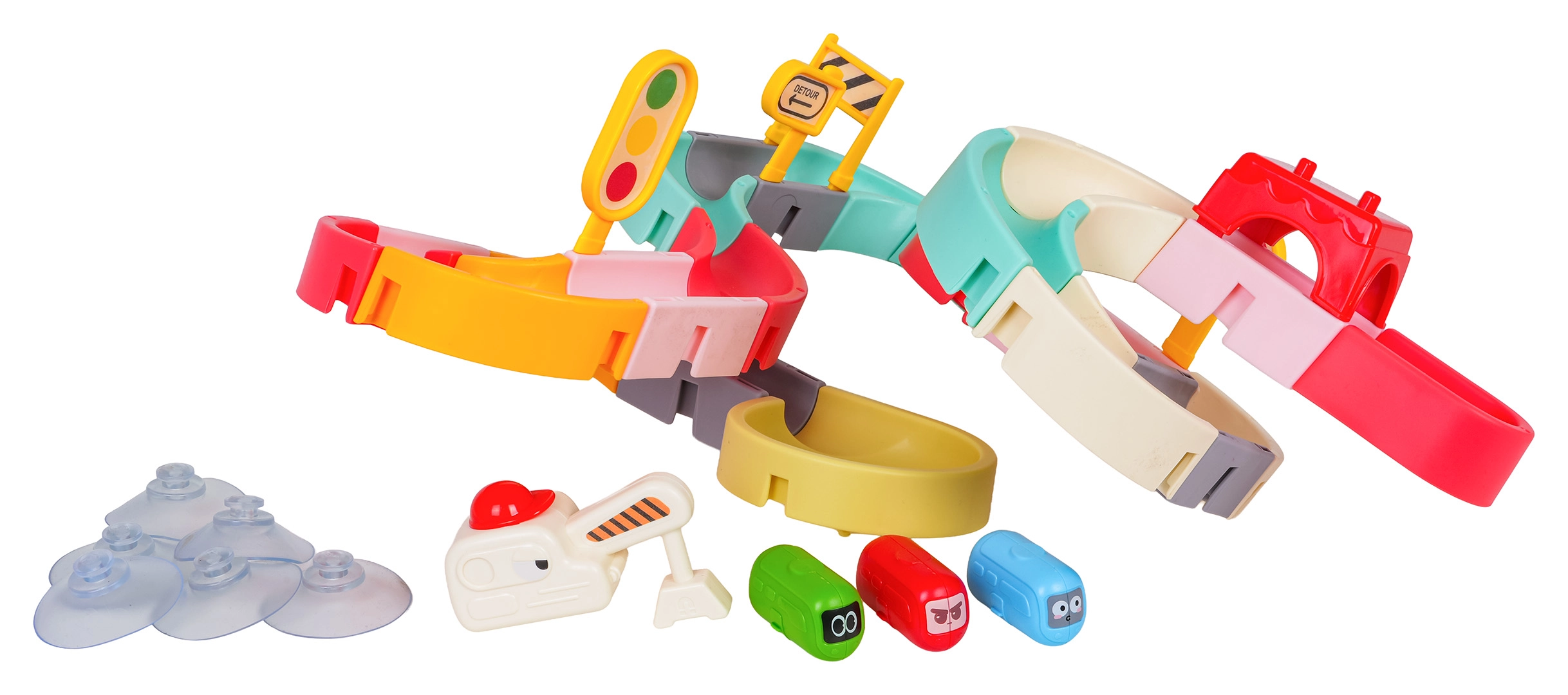 Zabava je varna in raznolika: kakovostna plastika brez ostrih robov, močni priseski za stabilnost in živahne barve, ki otroke spodbujajo k ustvarjanju vedno novih prog. Priložene so tudi prometne znamke, zapornice in nalepke za še več ustvarjalnosti.