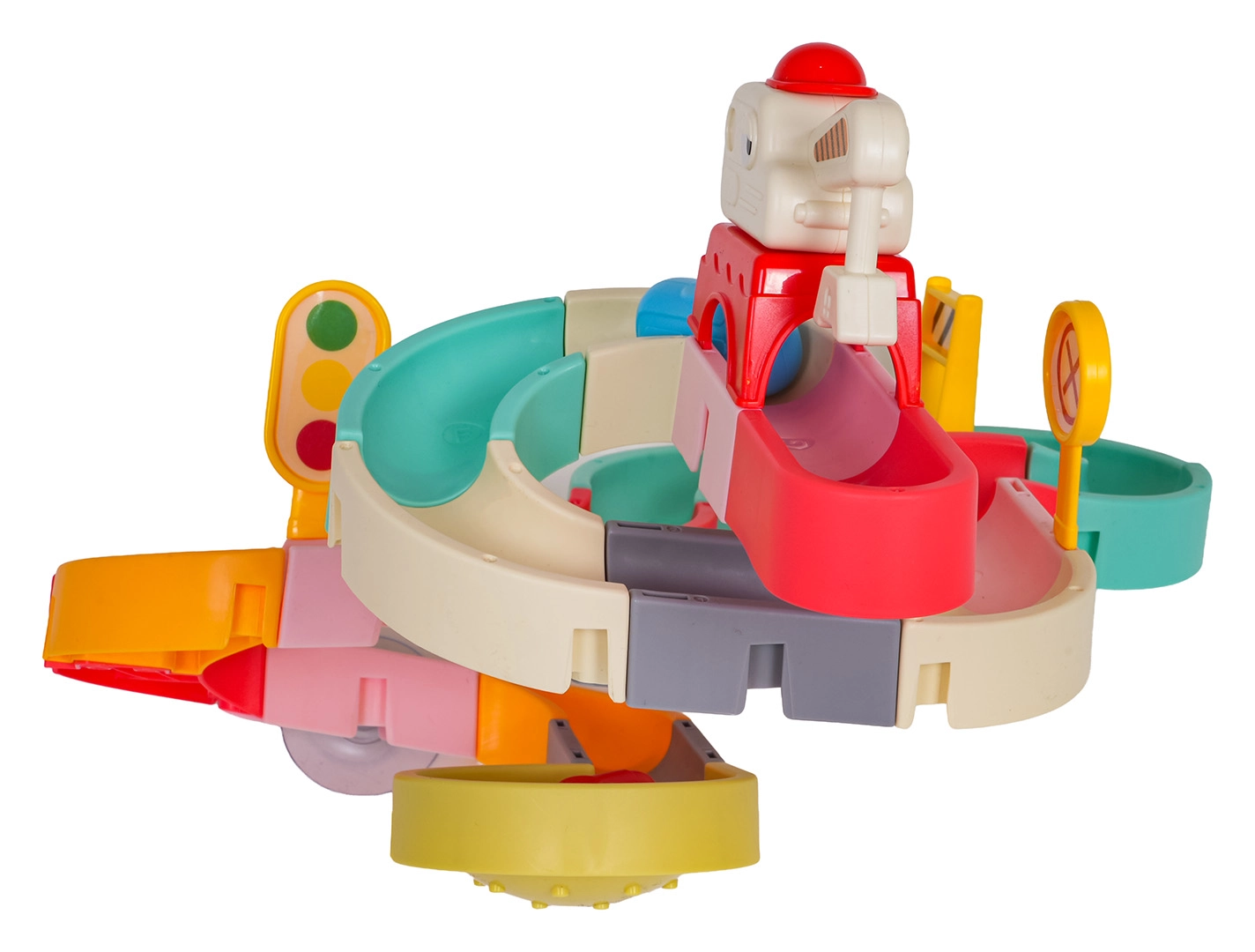 Barvni, med seboj povezljivi deli in prometni elementi podpirajo fino motoriko, domišljijo ter razumevanje vzroka in posledice.