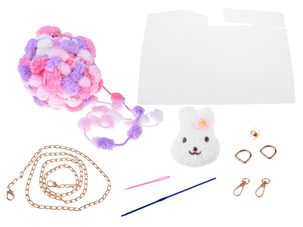 V pakiranju najdete barvito »pom‑pom« prejo, plastično platno kot osnovo, kovinsko verižico, igle, D‑obročke, zapiranje, kroglice za biserni ročaj in slikovna navodila. Korak za korakom boste preprosto sestavili izvirno mini torbico z zajčjim motivom, ki bo razveselila male in velike ustvarjalke.