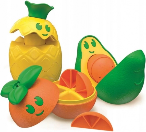 Ta ustvarjalni komplet s tremi vrstami sadja je zasnovan za male raziskovalce. Vsak sadež ponuja drugačen način igre: avokado se odpira in v notranjosti skriva odstranljivo kroglico, dele ananasa je mogoče zložiti enega na drugega, pomaranča pa se razdeli na 4 dele, ki jih otroci ponovno sestavijo. Zaradi različnih tekstur in oblik igrača prinaša raznolike senzorične dražljaje.