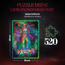 V paketu najdete vse, kar potrebujete za sestavljanje in razstavljanje končnega dela: puzzle s 520 koščki, trd karton za podlago, lepilo, montažni plastični okvir, elektronski modul in RGB LED trak, prav tako referenčni plakat in navodila. Po sestavi ima slika dimenzije približno 36 × 49 cm in je odlična kot dekoracija z učinkom prekrivanja treh barvnih nivojev.