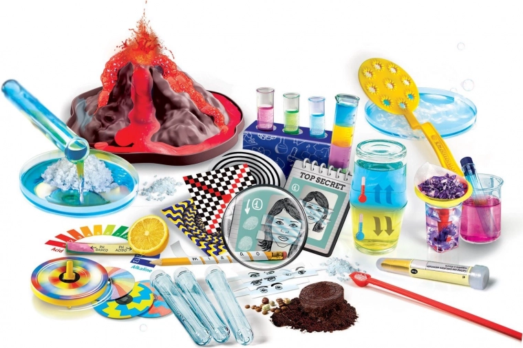 V pakiranju je pestra paleta laboratorijskih pripomočkov – epruvete, stojalo, merilne posodice, pripomočki za optične poskuse in model vulkana. Ne manjkajo niti pregledne kartice/ilustriran priročnik, ki otroke vodijo korak za korakom ter jih učijo natančnosti in potrpežljivosti. Komplet je idealen za učenje doma in zabavo s starši.