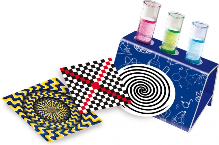 Komplet vsebuje kartice z optičnimi iluzijami in preproste poskuse, ki otrokom pokažejo, kako človeško oko zaznava svetlobo, barve in vzorce.