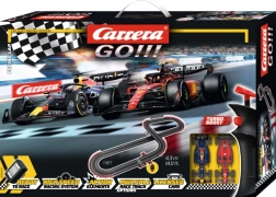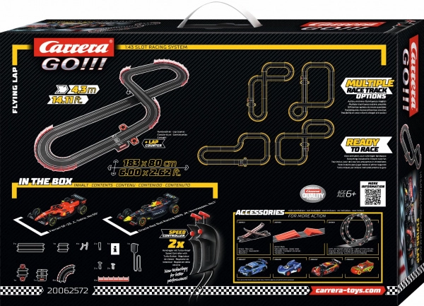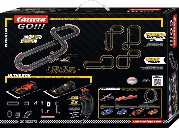 Vstopite v svet hitrosti z avtocesto Carrera GO!!! Flying Lap. Z dimenzijami po sestavi 183 × 80 cm in pametno zasnovano stezo z nadvozom ponuja dinamične dirke dveh ikon Formule 1 – FERRARI SF-23 »C. Sainz« in RED BULL RACING RB19 »M. Verstappen«. Analogni sistem z mehanskim števcem krogov in upravljalniki s Turbo funkcijo prinaša razburljive dvoboje kolo na kolo.