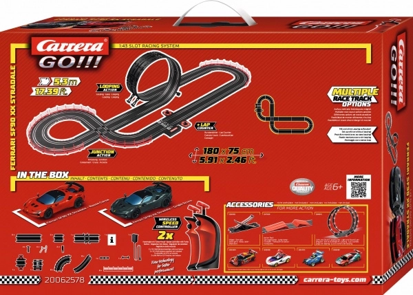 Zgradite si lastno dirkališče in uživajte v napetih dvobojih z dirkalno stezo Carrera GO Ferrari Supercar Power. Dve ekskluzivni maketi Ferrari SF-90 XX Stradale v barvah Rosso Corsa in Grigio Scuro, brezžični upravljalniki hitrosti ter odlični elementi proge, kot sta zanka in križišče, poskrbijo za dinamično vožnjo. Zahvaljujoč merilu 1:43 in kakovostni izdelavi je doživetje realistično in tekoče.