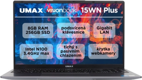 UMAX VisionBook 15WN Plus združuje privlačen tanek dizajn s praktičnimi funkcijami za vsakodnevno rabo. Varčen in živahen Intel Alder Lake-N100 zagotavlja gladko delovanje pisarniških aplikacij, brskanja po spletu, pretakanja in lažje multimedije. 15,6" IPS Full HD zaslon s tankimi robovi ponuja ostro sliko in široke vidne kote, medtem ko velik sledilnik in osvetljena tipkovnica s postavitvijo CZ/SK in numeričnim delom poskrbita za prijetno tipkanje tudi v večernih urah.