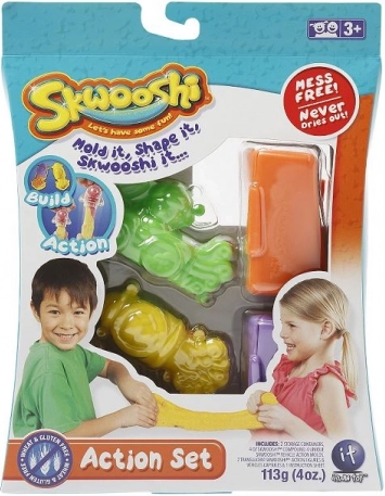 Komplet Skwooshi otrokom od 3 let naprej prinaša neskončne možnosti ustvarjanja. Posebna modelirna masa je prijetna na dotik, se ne maže in se ne lepi na roke ali pohištvo. Zaradi spremembe teksture ob segrevanju je oblikovanje enostavno in zabavno, končni izdelki pa so stabilni in podrobni.