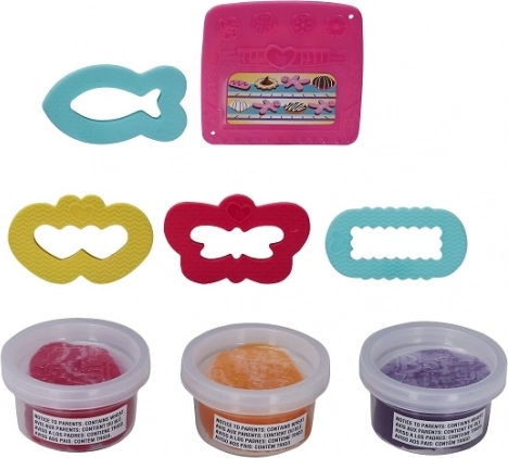 Na voljo sta dve tematski različici: »Makaron in pica« ter »Čas za sladkarije«. Vsak komplet vsebuje tri lončke modelirne mase in pet dodatkov za ustvarjanje posladkov. Modelirna masa je netoksična (ni namenjena uživanju) in primerna za male kuharje od 3. leta.