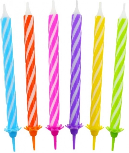 Paket vsebuje 24 svečk v priljubljenih barvah (modra, rdeča, rožnata, vijolična, rumena, zelena) in 12 praktičnih podstavkov, ki olajšajo stabilno namestitev na torto. Svečke so estetske in funkcionalne – idealna izbira za hitro in učinkovito dekoracijo.
