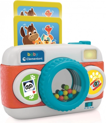 Ta govorilni fotoaparat znamke CLEMENTONI je zasnovan tako, da lahko majhne otroške roke zlahka upravljajo vse gumbe. Barvni gumbi sprožijo različne zvoke in melodije, utripajoča bliskavica pritegne pozornost, majhno ogledalce s kroglicami v objektivu pa spodbuja otroke k odkrivanju perspektive in globine.